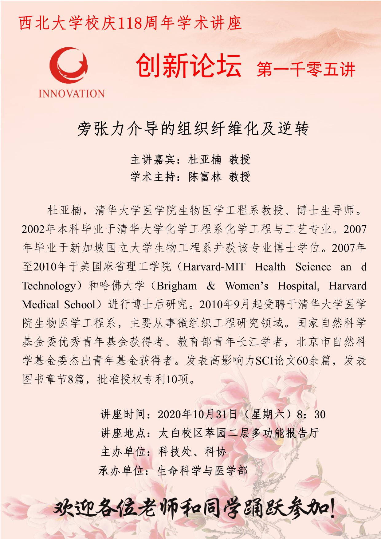 杜亚楠 教授 九游会在线登录官网创新论坛第一千零五讲暨校庆118周年学术讲座:旁张力介导的组织纤维化及逆转 讲座时间 2020年10月31日(星期六)8:30 讲座地点 太白校区萃园二层多功能报告厅 讲座人介绍 杜亚楠 教授 讲座内容