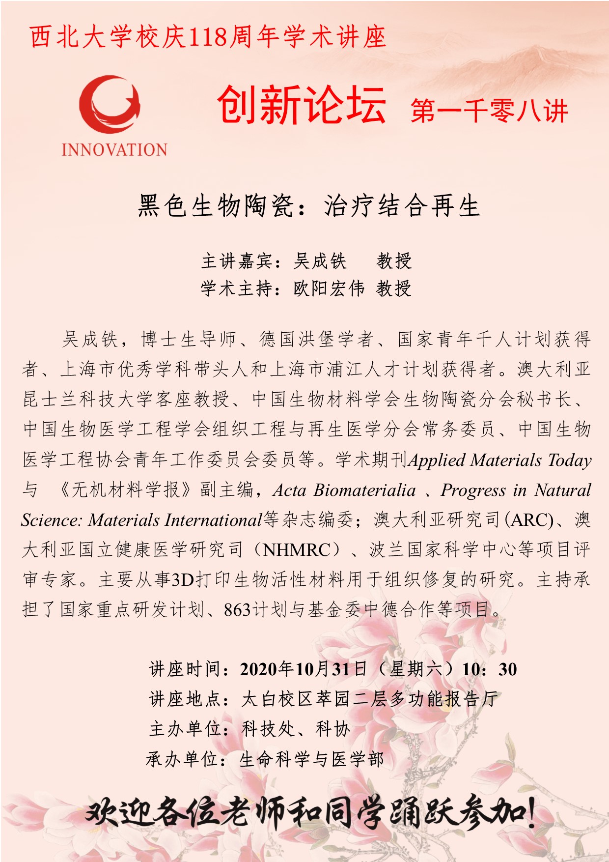 吴成铁 教授 九游会在线登录官网创新论坛第一千零八讲暨校庆118周年学术讲座:黑色生物陶瓷:治疗结合再生 讲座时间 2020年10月31日(星期六)10:30 讲座地点 太白校区萃园二层多功能报告厅 讲座人介绍 吴成铁 教授 讲座内容