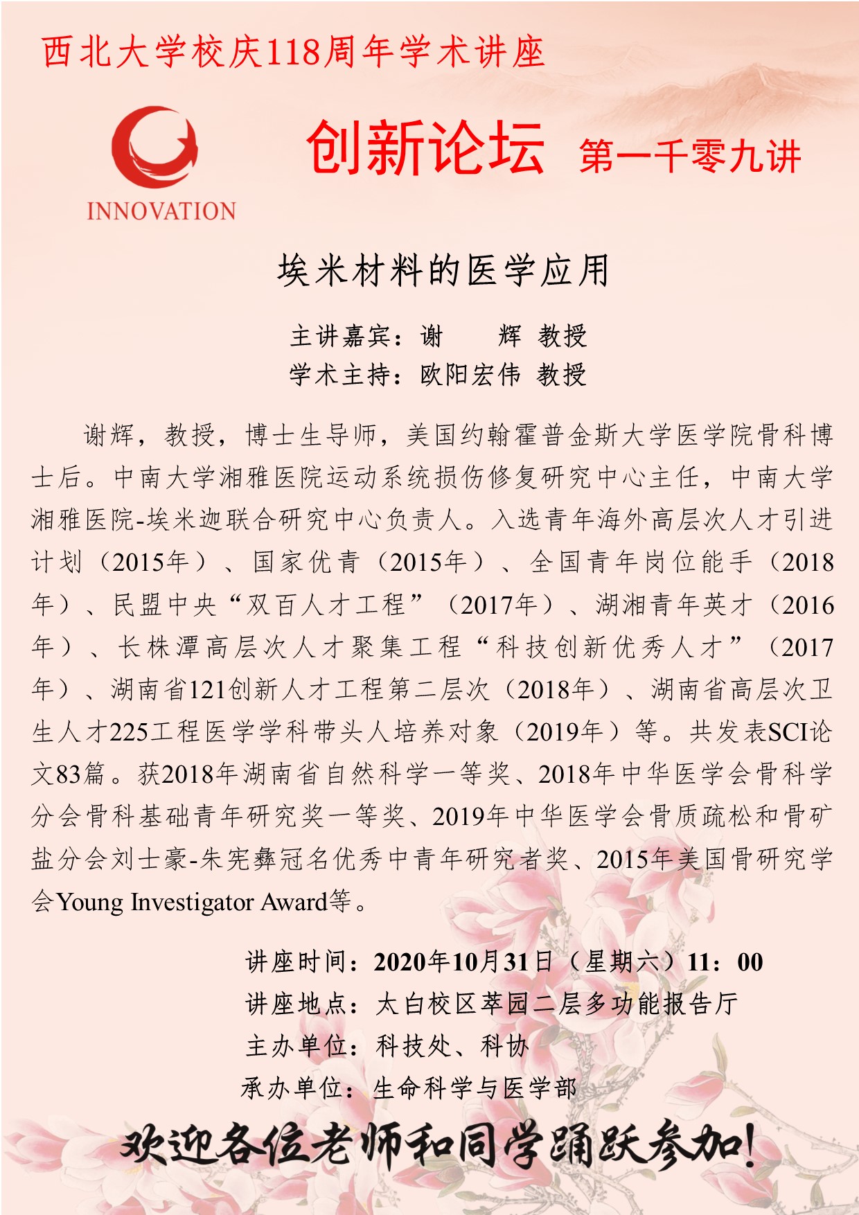 谢辉 教授 九游会在线登录官网创新论坛第一千零九讲暨校庆118周年学术讲座:埃米材料的医学应用 讲座时间 2020年10月31日(星期六)11:00 讲座地点 太白校区萃园二层多功能报告厅 讲座人介绍 谢辉 教授 讲座内容