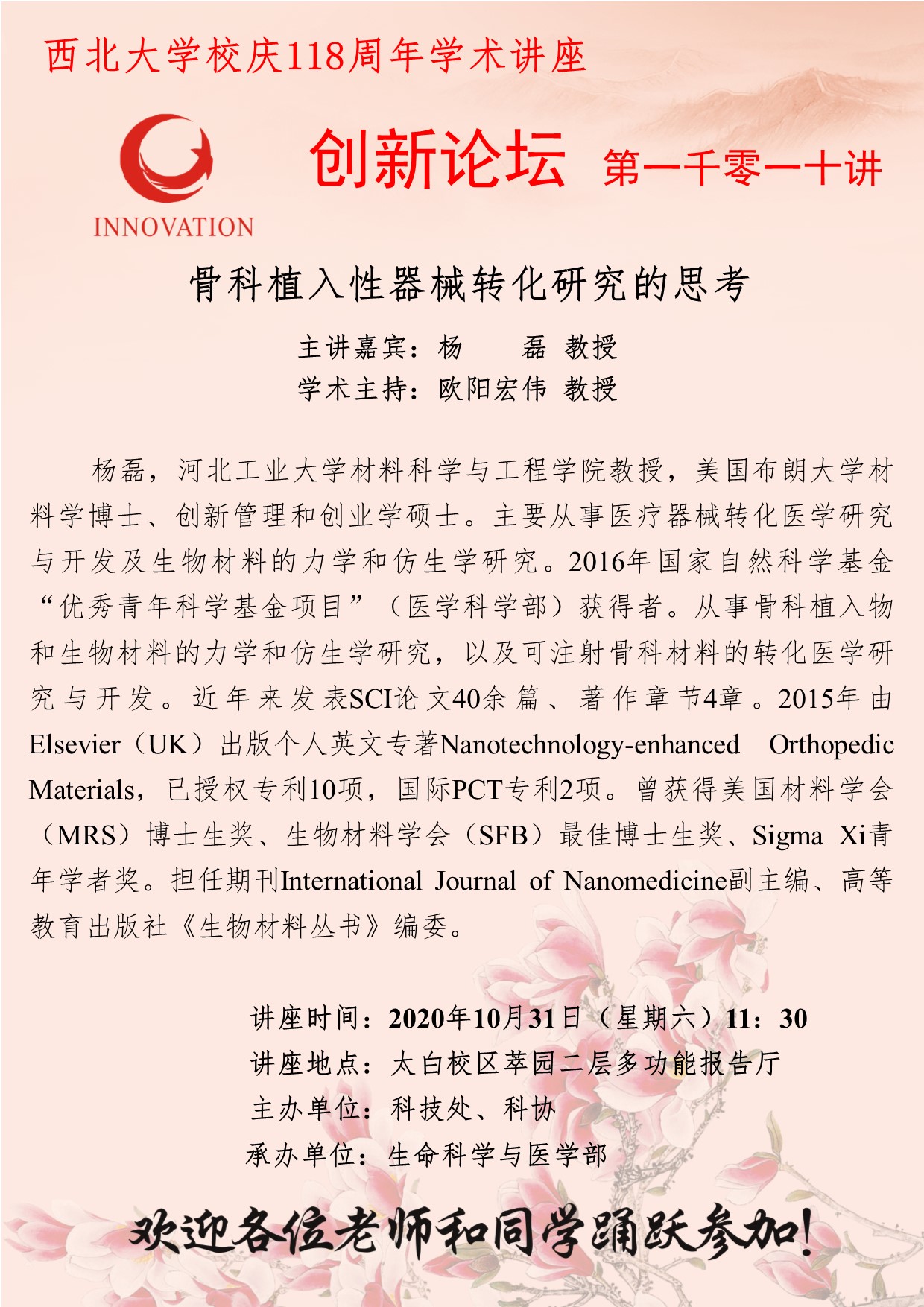 杨磊 教授 九游会在线登录官网创新论坛第一千零一十讲暨校庆118周年学术讲座:骨科植入性器械转化研究的思考 讲座时间 2020年10月31日(星期六)11:30 讲座地点 太白校区萃园二层多功能报告厅 讲座人介绍 杨磊 教授 讲座内容