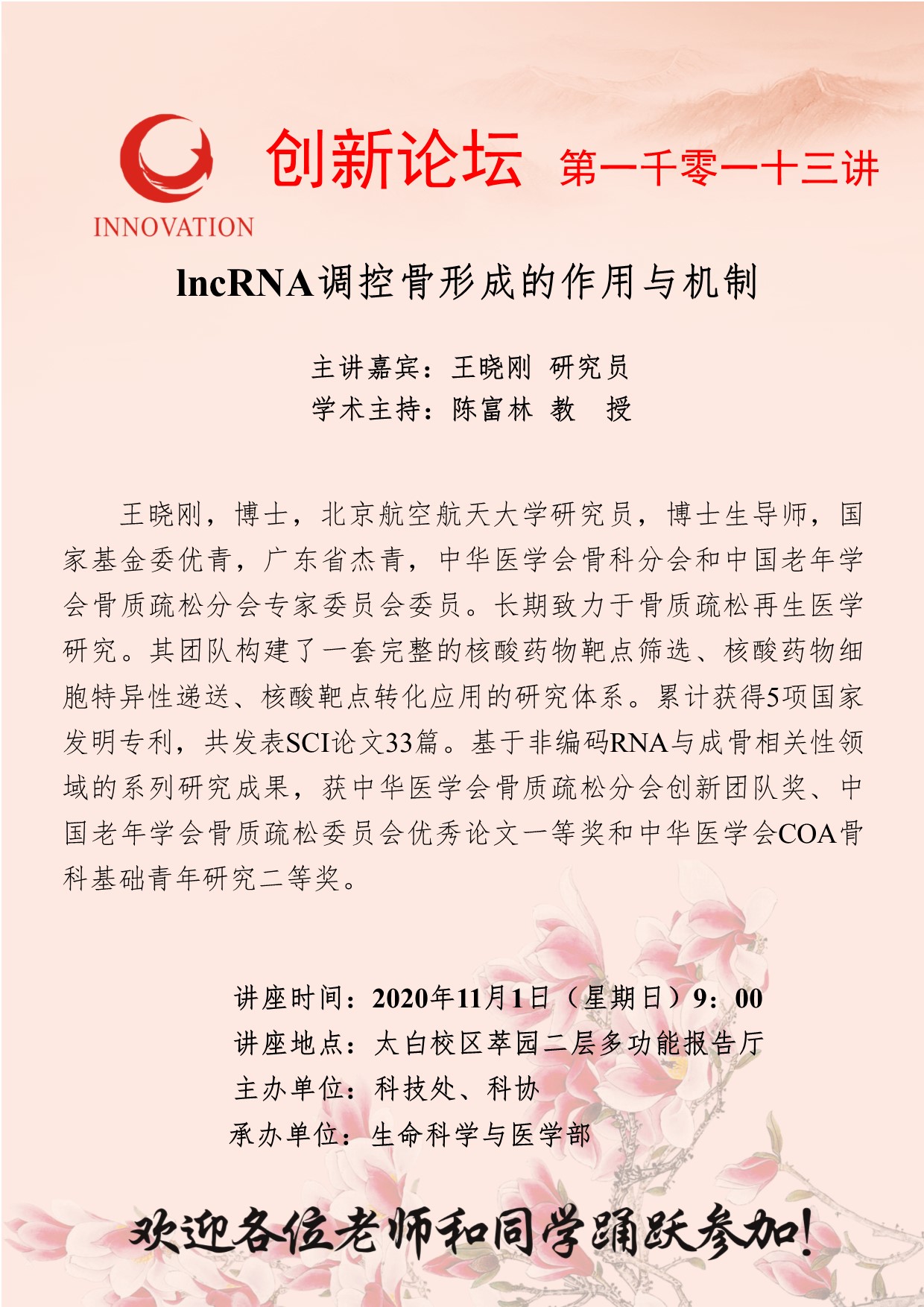 王晓刚 研究员 九游会在线登录官网创新论坛第一千零一十三讲:lncRNA调控骨形成的作用与机制 讲座时间 2020年11月1日(星期日)9:00 讲座地点 太白校区萃园二层多功能报告厅 讲座人介绍 王晓刚 研究员 讲座内容