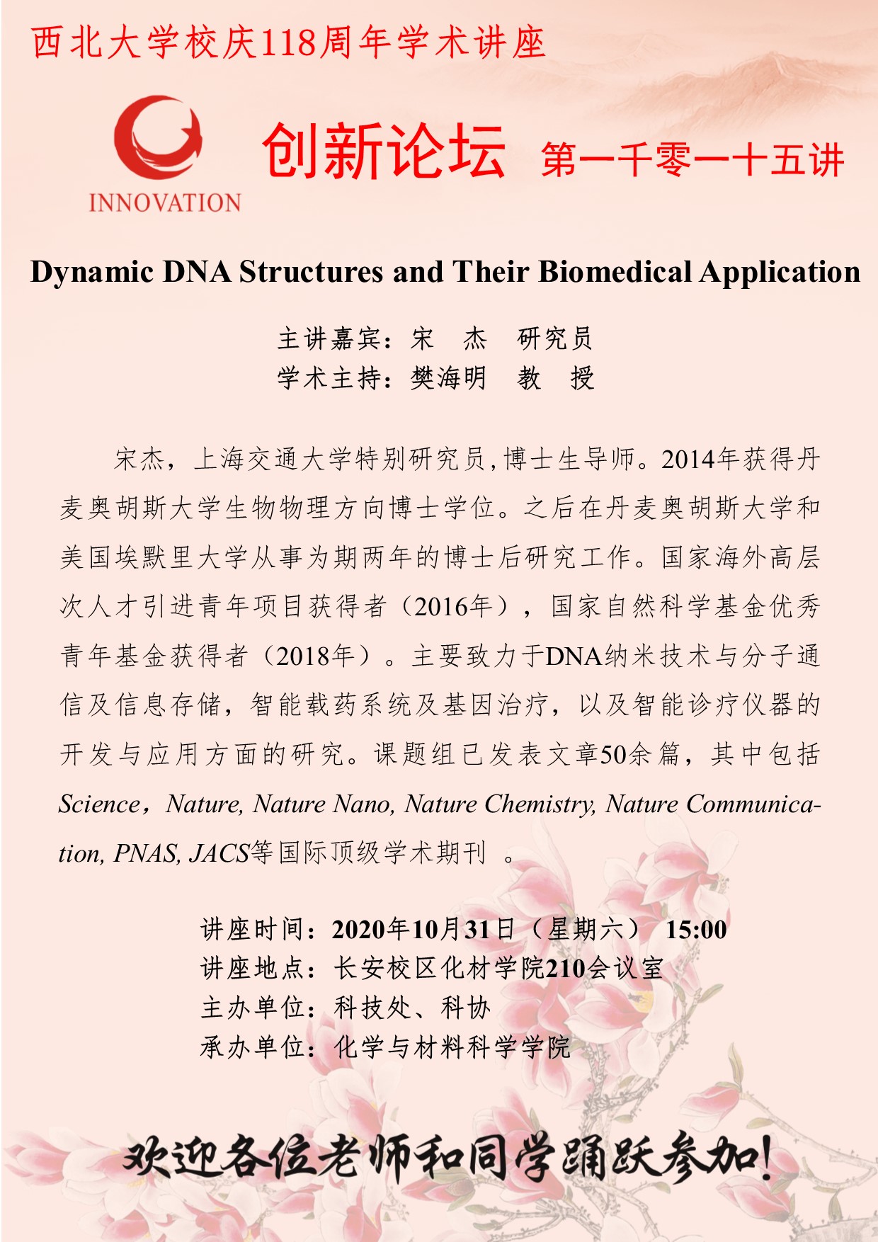 宋杰 研究员 九游会在线登录官网创新论坛第一千零一十五讲暨校庆118周年学术讲座:Dynamic DNA Structures and Their Biomedical Application 讲座时间 2020年10月31日(星期六)15:00 讲座地点 化学与材料科学学院210室 讲座人介绍 宋杰 研究员 讲座内容