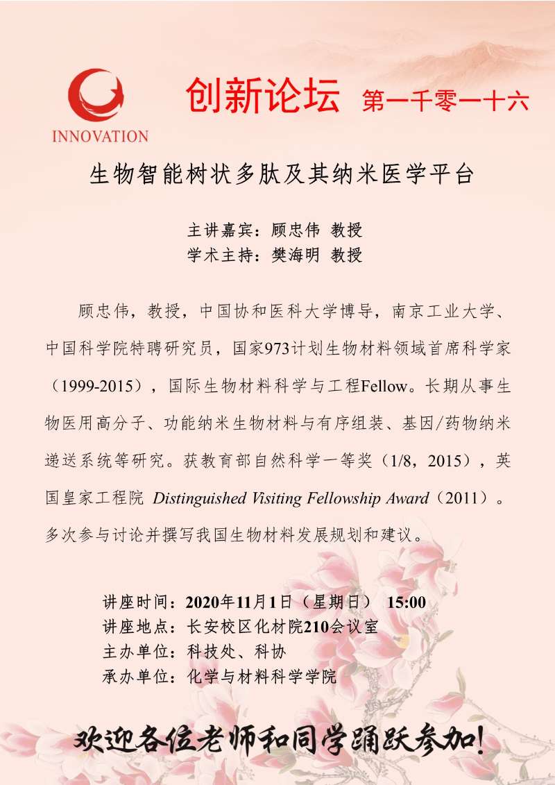顾忠伟 教授 九游会在线登录官网创新论坛第一千零一十六讲:生物智能树状多肽及其纳米医学平台 讲座时间 2020年11月1日(星期日) 15:00 讲座地点 长安校区化材院210会议室 讲座人介绍 顾忠伟 教授 讲座内容