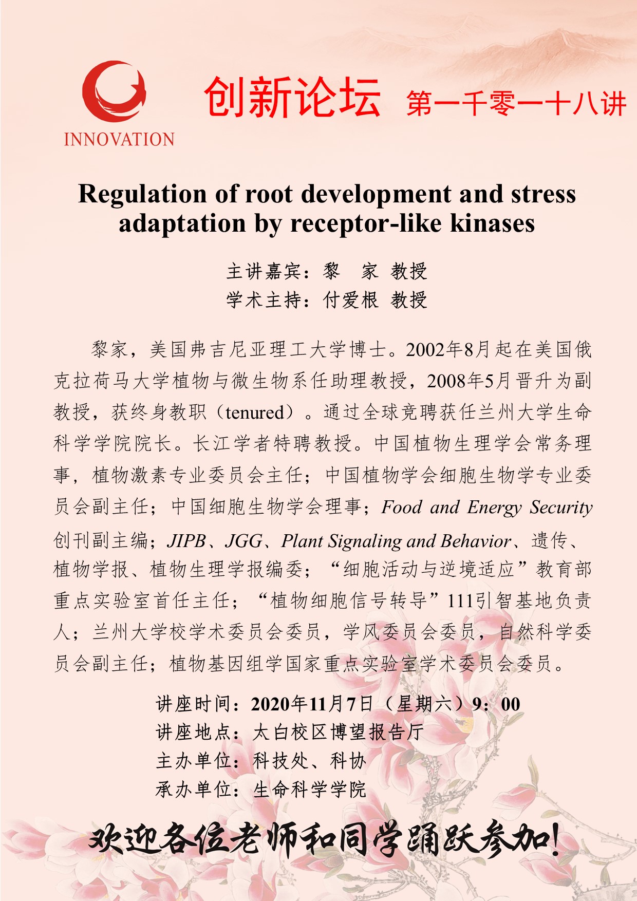 黎 家 教授 九游会在线登录官网创新论坛第一千零一十八讲:Regulation of root development and stress adaptation by receptor-like kinases 讲座时间 2020年11月7日(星期六)9:00 讲座地点 太白校区博望报告厅 讲座人介绍 黎 家 教授 讲座内容
