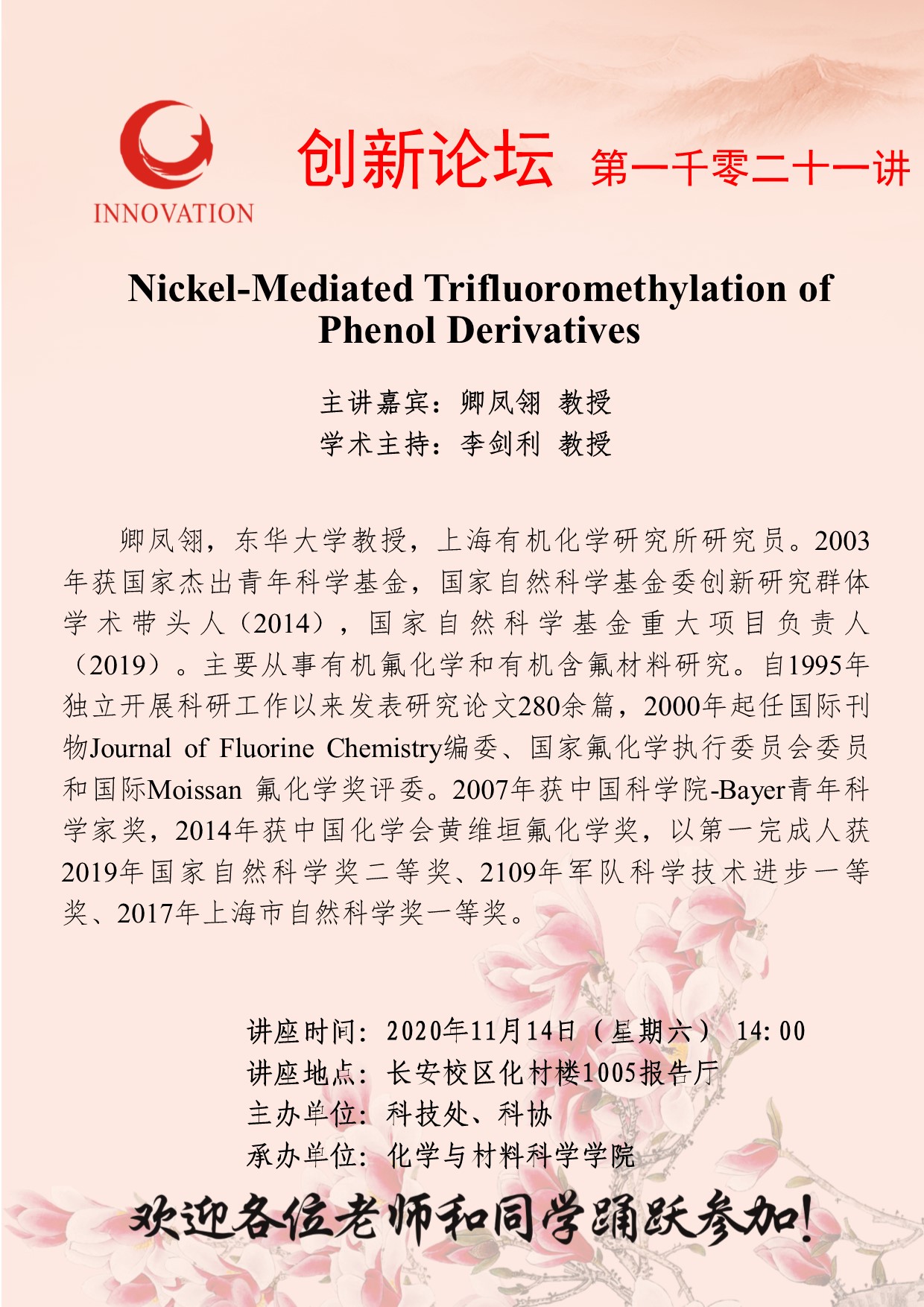 卿凤翎 教授 九游会在线登录官网创新论坛第一千零二十一讲:Nickel-Mediated Trifluoromethylation of Phenol Derivatives 讲座时间 2019年11月14日(星期六)14:00 讲座地点 长安校区化材楼1005报告厅 讲座人介绍 卿凤翎 教授 讲座内容