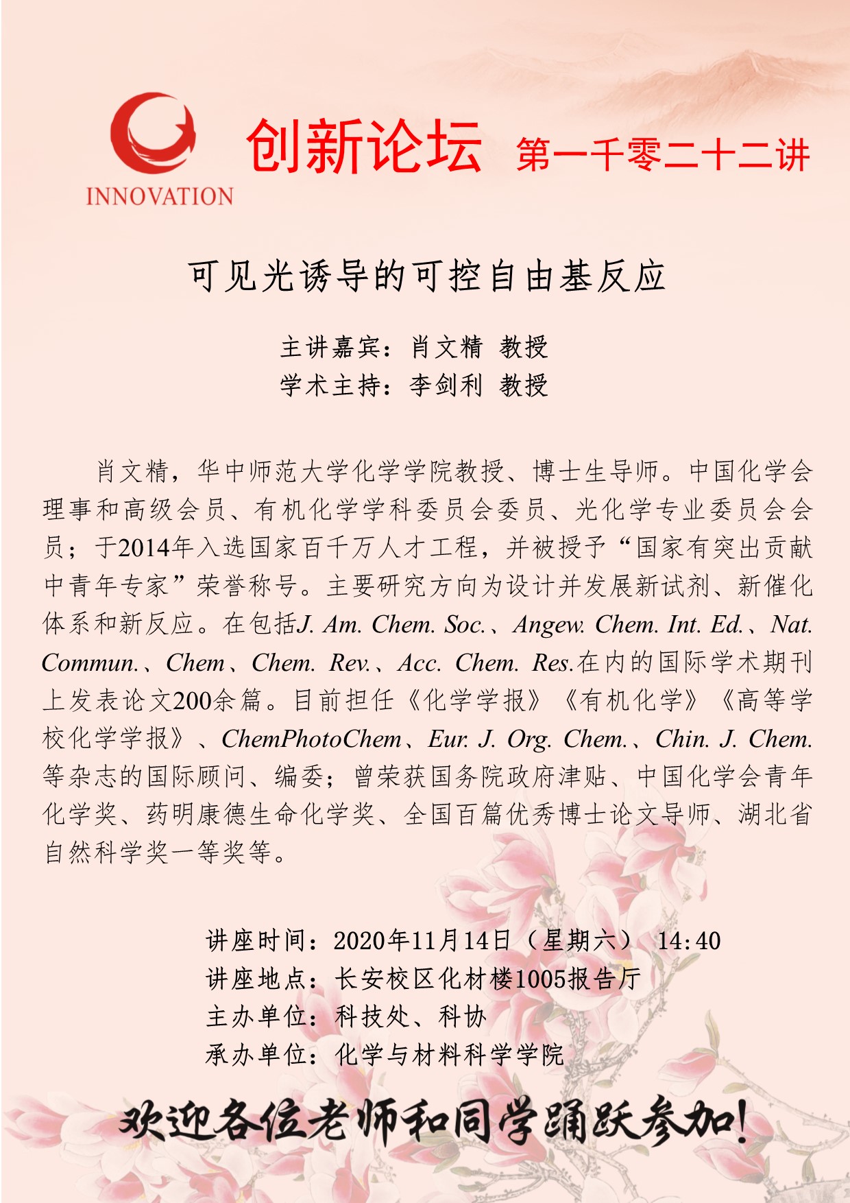 肖文精 教授 九游会在线登录官网创新论坛第一千零二十二讲:可见光诱导的可控自由基反应 讲座时间 2020年11月14日(周六)14:40 讲座地点 长安校区化材楼1005报告厅 讲座人介绍 肖文精 教授 讲座内容