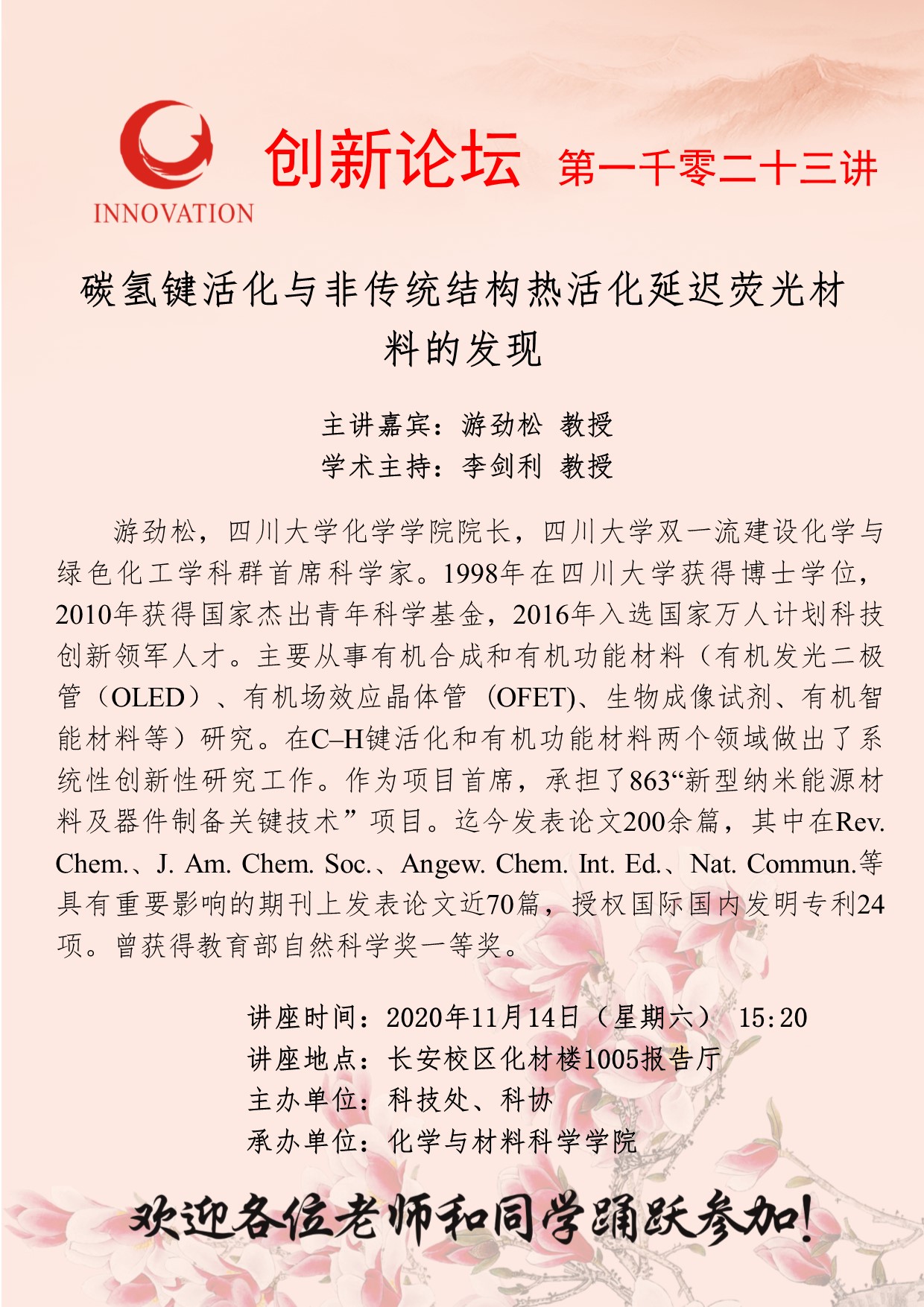 游劲松 教授 九游会在线登录官网创新论坛第一千零二十三讲:碳氢键活化与非传统结构热活化延迟荧光材料的发现 讲座时间 2020年 11月14日(周六)15:20 讲座地点 长安校区化材楼1005报告厅 讲座人介绍 游劲松 教授 讲座内容