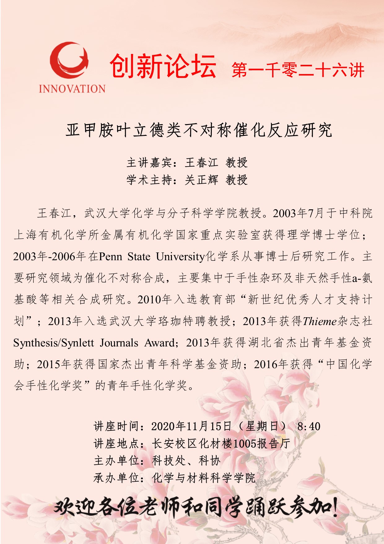 王春江 教授 九游会在线登录官网创新论坛第一千零二十六讲:亚甲胺叶立德类不对称催化反应研究 讲座时间 2020年 11月15日(星期日)8:40 讲座地点 长安校区化材楼1005报告厅 讲座人介绍 王春江 教授 讲座内容