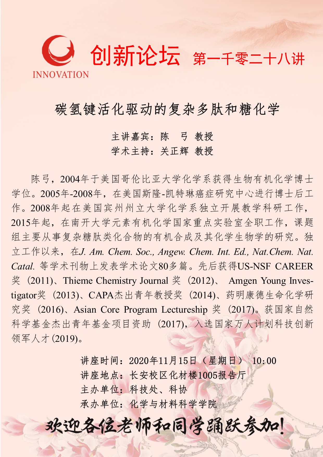 陈 弓 教授 九游会在线登录官网创新论坛第一千零二十八讲:碳氢键活化驱动的复杂多肽和糖化学 讲座时间 2020年 11月15日(星期日)10:00 讲座地点 长安校区化材楼1005报告厅 讲座人介绍 陈 弓 教授 讲座内容