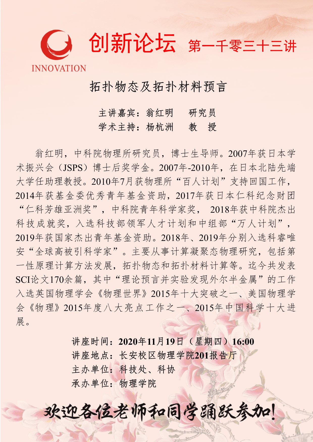 翁红明 研究员 九游会在线登录官网创新论坛第一千零三十三讲:拓扑物态及拓扑材料预言 讲座时间 2020年11月19日(星期四)16:00 讲座地点 长安校区物理学院201报告厅 讲座人介绍 翁红明 研究员 讲座内容
