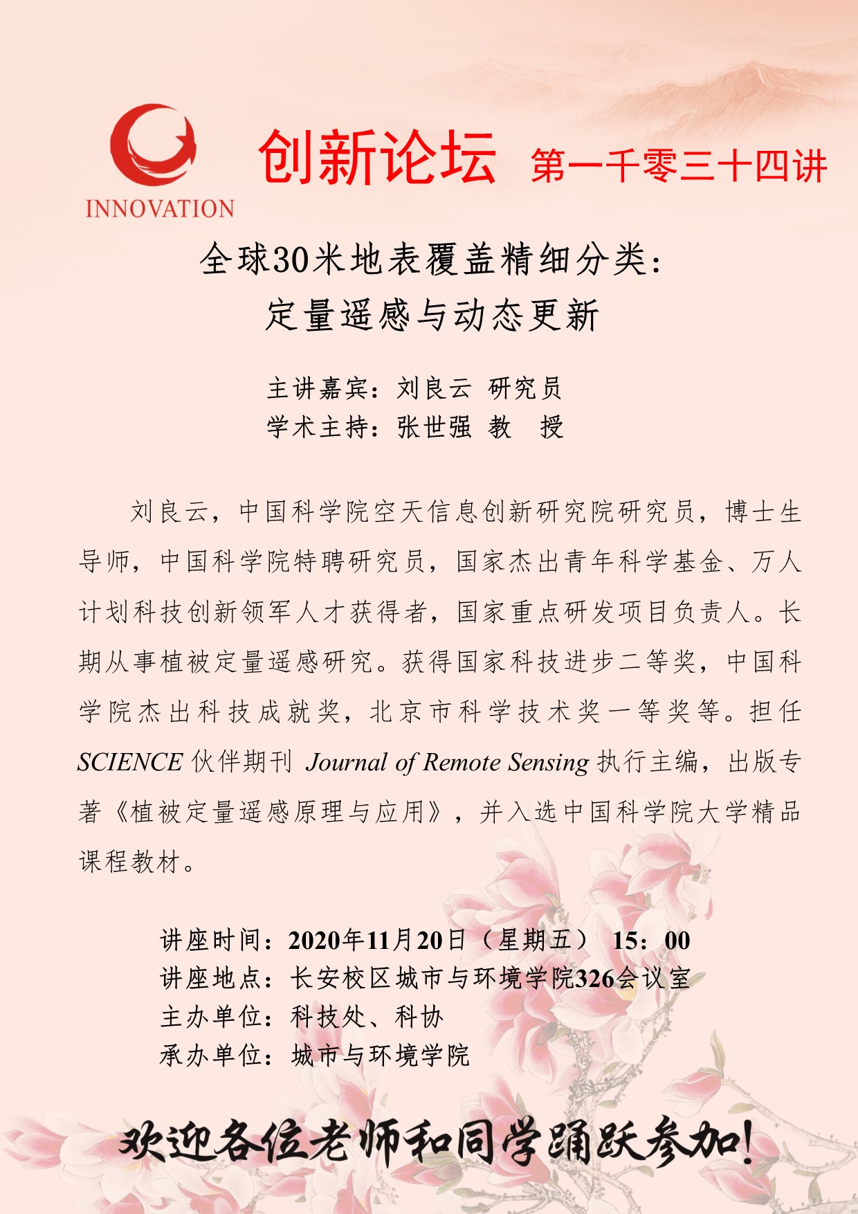 刘良云 研究员 九游会在线登录官网创新论坛第一千零三十四讲:全球30米地表覆盖精细分类:定量遥感与动态更新 讲座时间 2020年11月20日(星期五) 15:00 讲座地点 长安校区城市与环境学院326会议室 讲座人介绍 刘良云 研究员 讲座内容