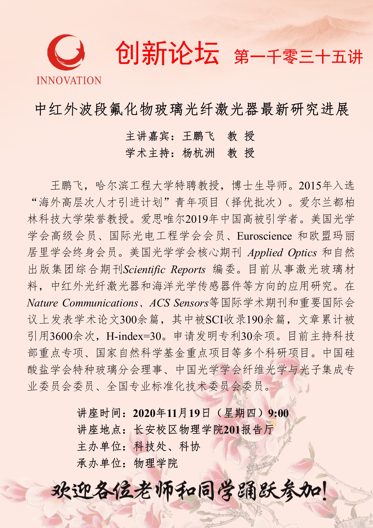 王鹏飞 教授 九游会在线登录官网创新论坛第一千零三十五讲:中红外波段氟化物玻璃光纤激光器最新研究进展 讲座时间 2020年11月19日(星期四) 9:00 讲座地点 长安校区物理学院201报告厅 讲座人介绍 王鹏飞 教授 讲座内容