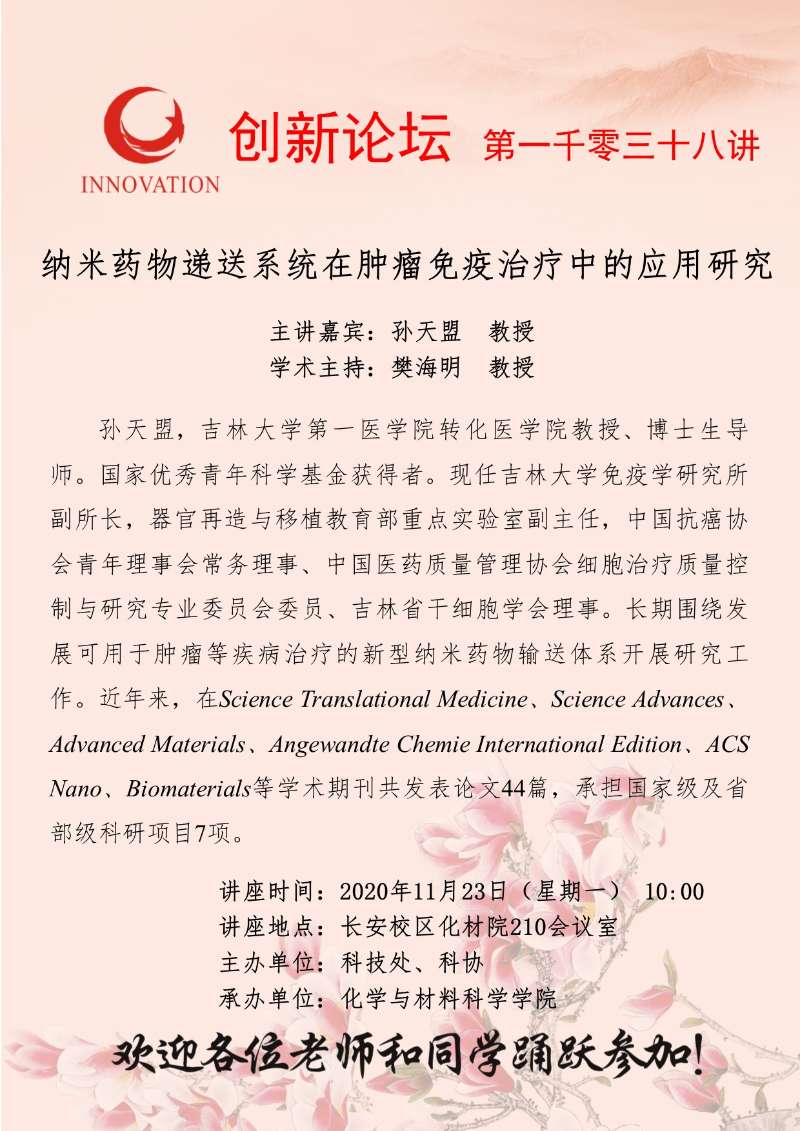 孙天盟 教授 九游会在线登录官网创新论坛第一千零三十八讲:纳米药物递送系统在肿瘤免疫治疗中的应用研究 讲座时间 2020年11月23日(星期一) 10:00 讲座地点 长安校区化材院210会议室 讲座人介绍 孙天盟 教授 讲座内容