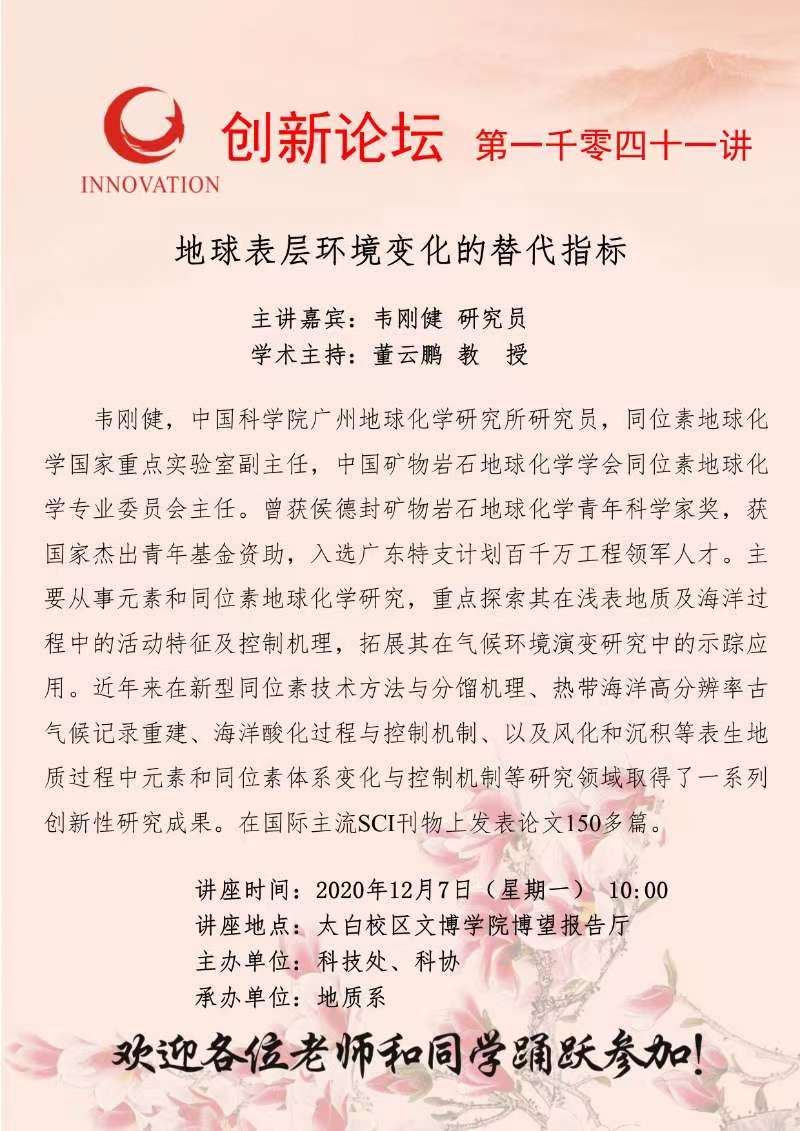 韦刚健 研究员 九游会在线登录官网创新论坛第一千零四十一讲:地球表层环境变化的替代指标 讲座时间 2020年12月7日(星期一) 10:00 讲座地点 太白校区文博学院博望报告厅 讲座人介绍 韦刚健 研究员 讲座内容