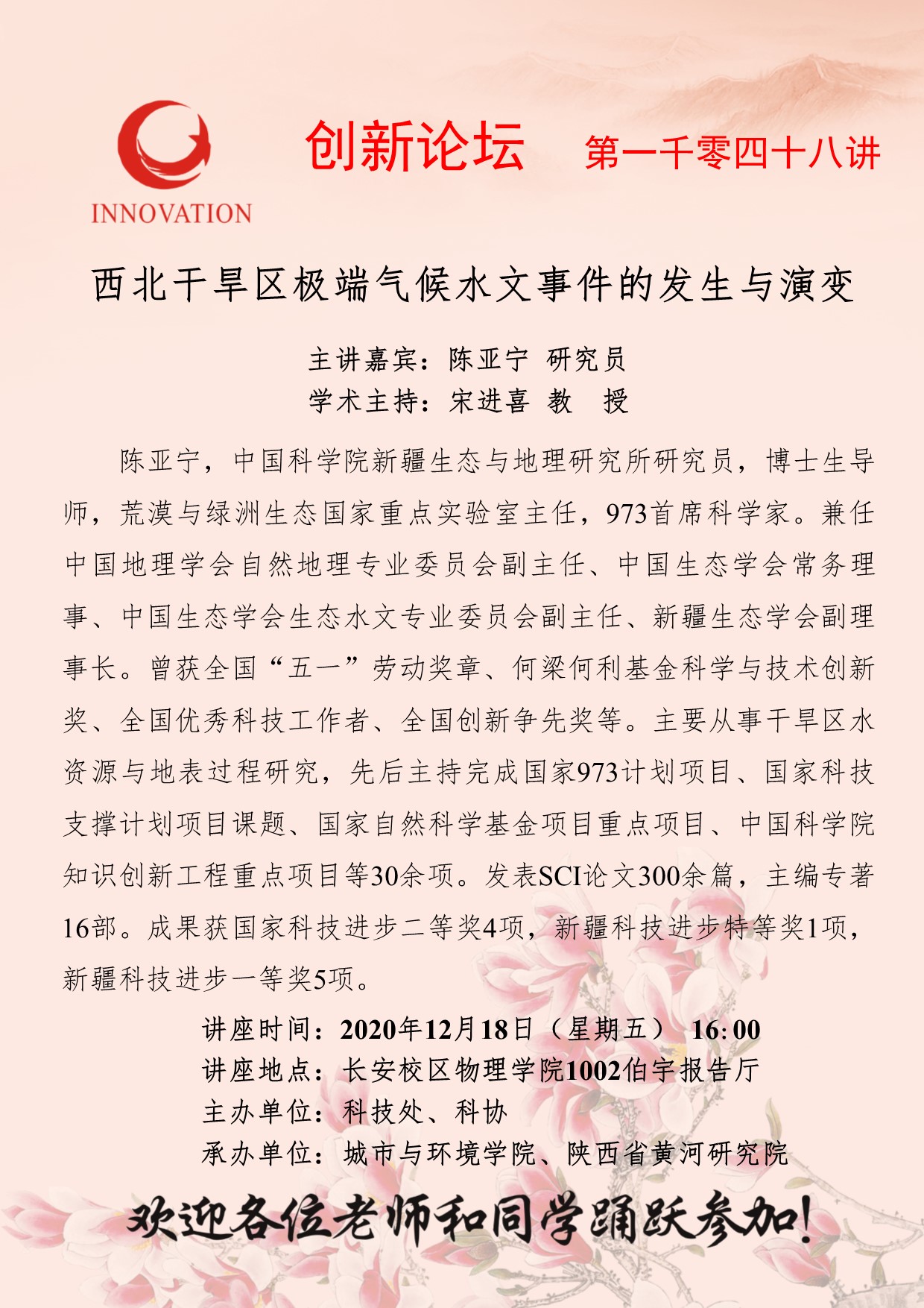 陈亚宁 研究员 九游会在线登录官网创新论坛第一千零四十八讲:西北干旱区极端气候水文事件的发生与演变研究 讲座时间 2020年12月18日(星期五)16:00 讲座地点 长安校区物理楼伯宇报告厅 讲座人介绍 陈亚宁 研究员 讲座内容