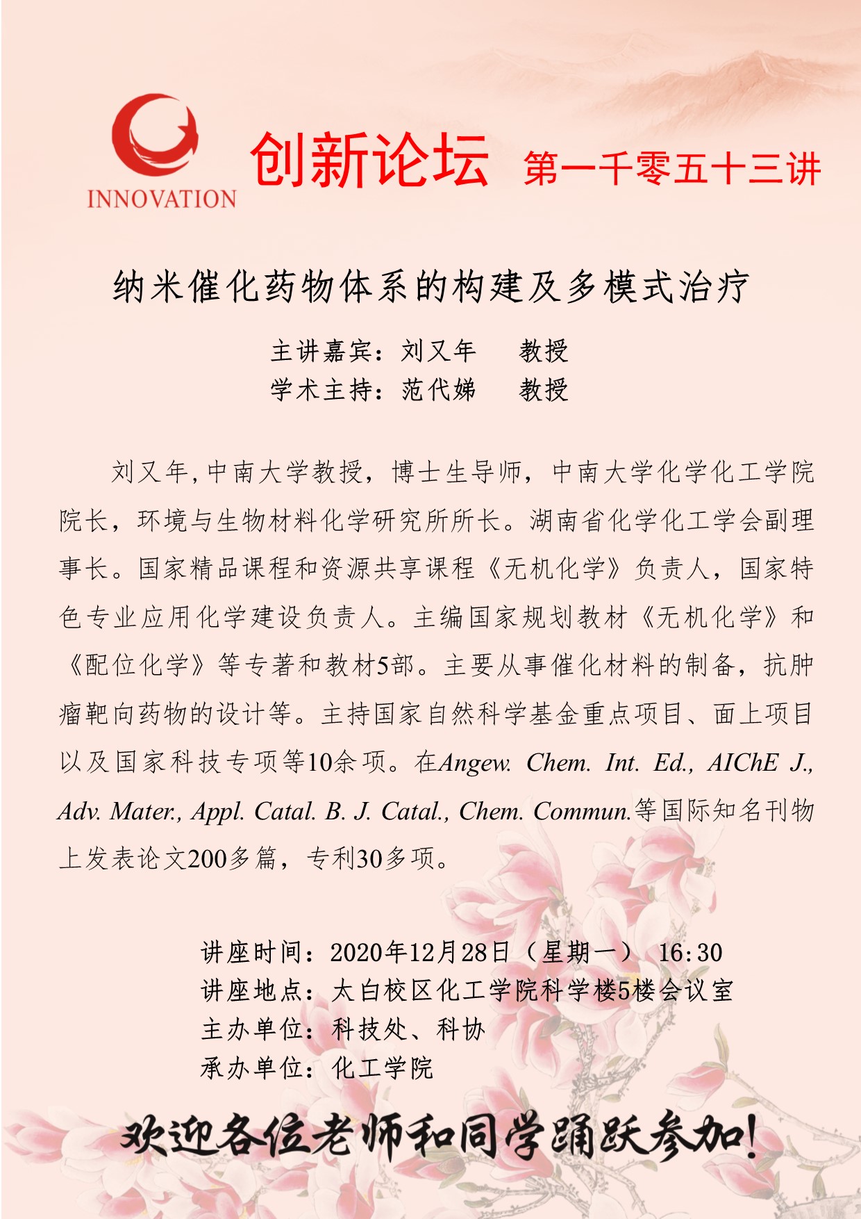 刘又年 教授 九游会在线登录官网创新论坛第一千零五十三讲:纳米催化药物体系的构建及多模式治疗 讲座时间 2020年12月28日(星期一) 16:30 讲座地点 太白校区化工学院科学楼5楼会议室 讲座人介绍 刘又年 教授 讲座内容