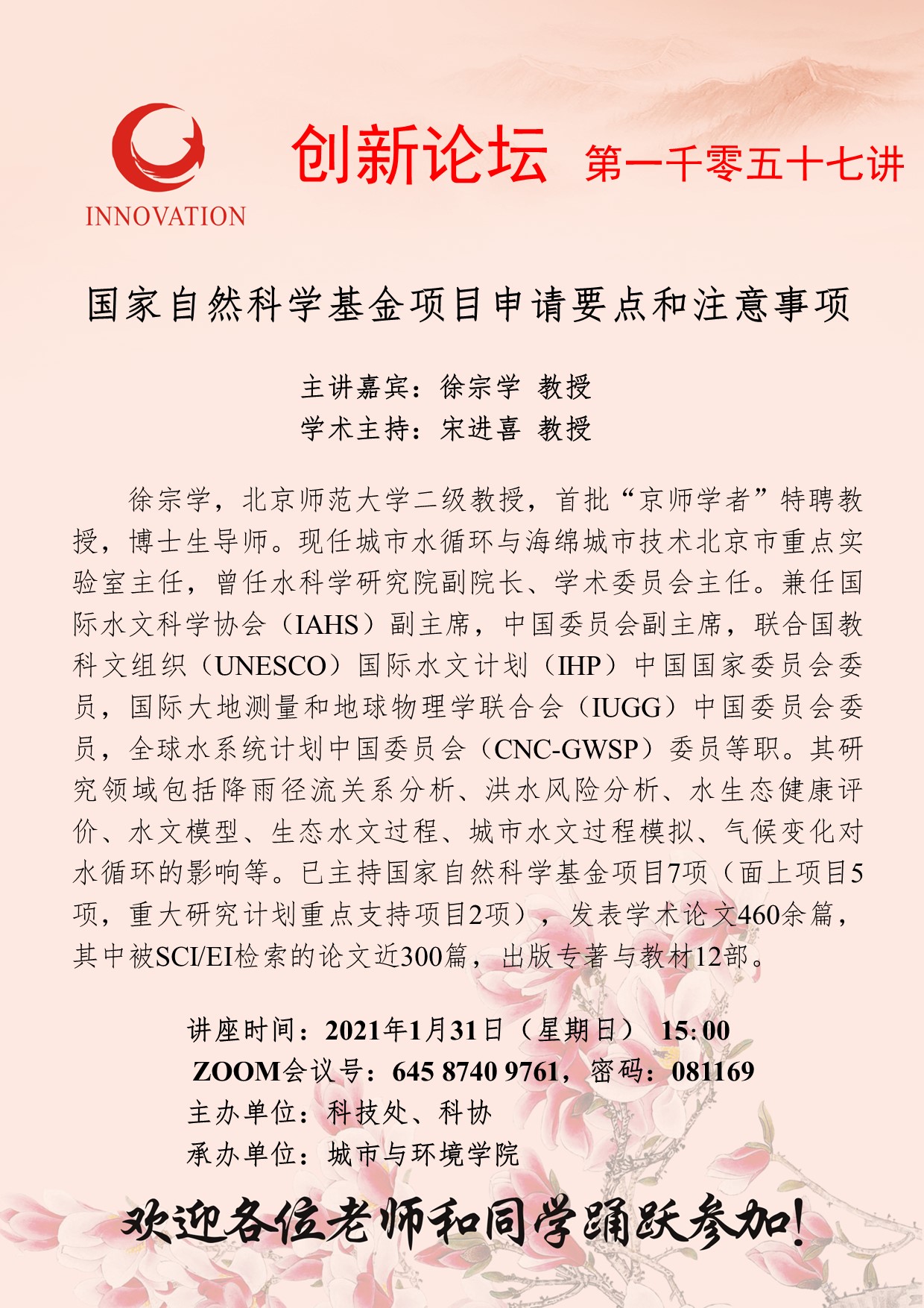 徐宗学 教授 九游会在线登录官网创新论坛第一千零五十七讲:国家自然科学基金项目申请要点和注意事项 讲座时间 2021年1月31日(星期日) 15:00 讲座地点 ZOOM会议号:64587409761,密码:081169 讲座人介绍 徐宗学 教授 讲座内容