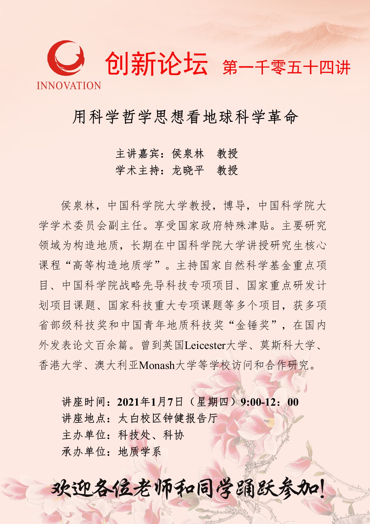 侯泉林 教授 九游会在线登录官网创新论坛第一千零五十四讲:用科学哲学思想看地球科学革命 讲座时间 2021年1月7日(星期四) 9:00-12:00 讲座地点 太白校区钟健报告厅 讲座人介绍 侯泉林 教授 讲座内容