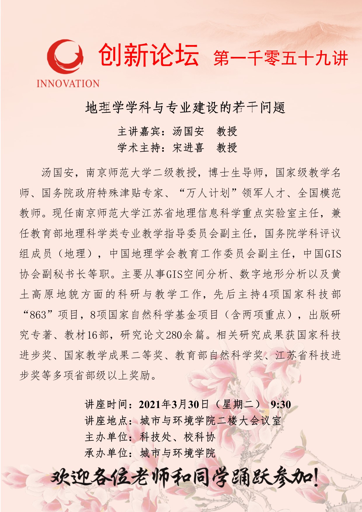 汤国安 教授 九游会在线登录官网创新论坛第一千零五十九讲:地理学学科与专业建设的若干问题 讲座时间 2021年3月30日(星期二) 9:30 讲座地点 城市与环境学院二楼大会议室 讲座人介绍 汤国安 教授 讲座内容