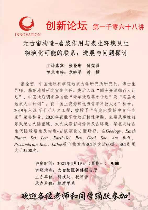 张拴宏 研究员 九游会在线登录官网创新论坛第一千零六十八讲:元古宙构造-岩浆作用与表生环境及生物演化可能的联系:进展与问题探讨 讲座时间 2021年4月19日(星期一) 9:00 讲座地点 太白校区钟健报告厅 讲座人介绍 张拴宏 研究员 讲座内容