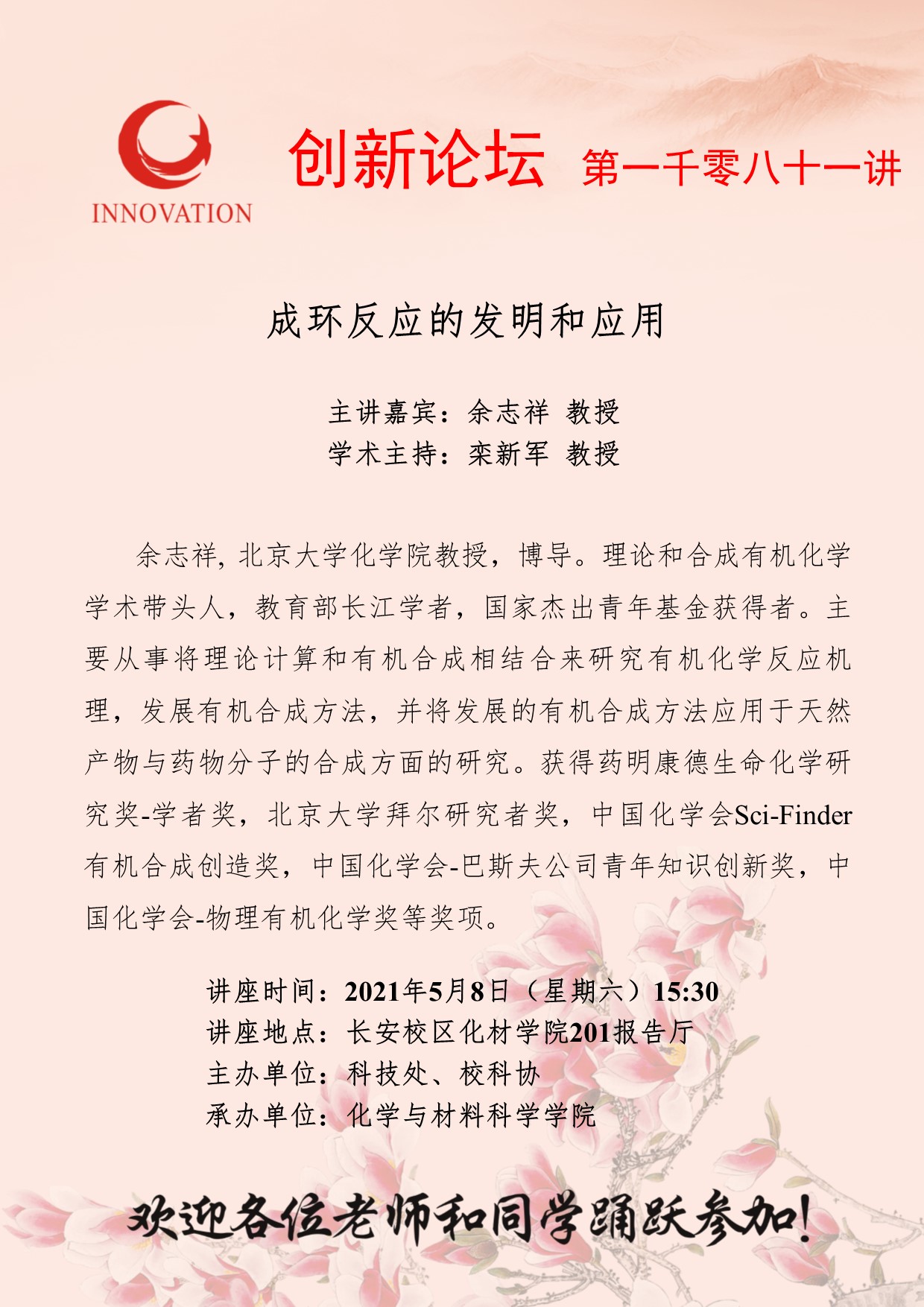 余志祥 教授 九游会在线登录官网创新论坛第一千零八十一讲:成环反应的发明和应用 讲座时间 2021年5月8日(星期六)15:30 讲座地点 长安校区化材学院201报告厅 讲座人介绍 余志祥 教授 讲座内容
