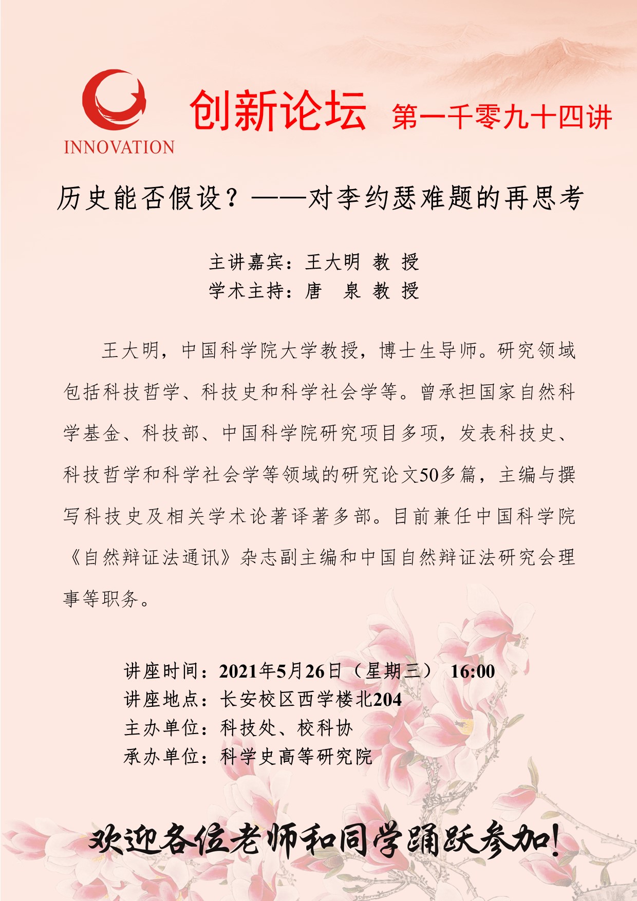 王大明 教 授 九游会在线登录官网创新论坛第一千零九十四讲:历史能否假设?——对李约瑟难题的再思考 讲座时间 2021年5月26日(星期三) 16:00 讲座地点 长安校区西学楼北204 讲座人介绍 王大明 教 授 讲座内容