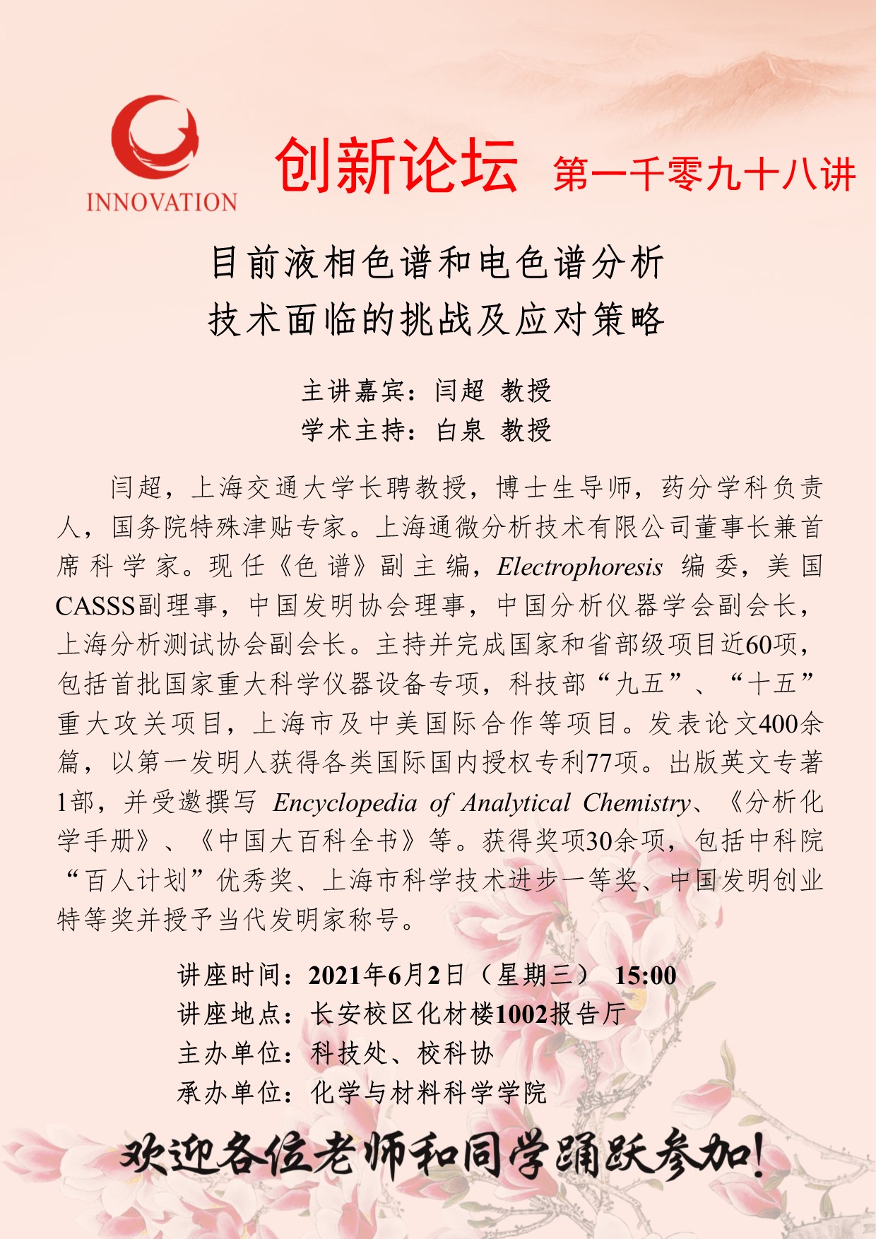 闫超 教授 九游会在线登录官网创新论坛第一千零九十八讲:目前液相色谱和电色谱分析技术面临的挑战及应对策略 讲座时间 2021年6月2日(星期三) 15:00 讲座地点 长安校区化材楼1002报告厅 讲座人介绍 闫超 教授 讲座内容