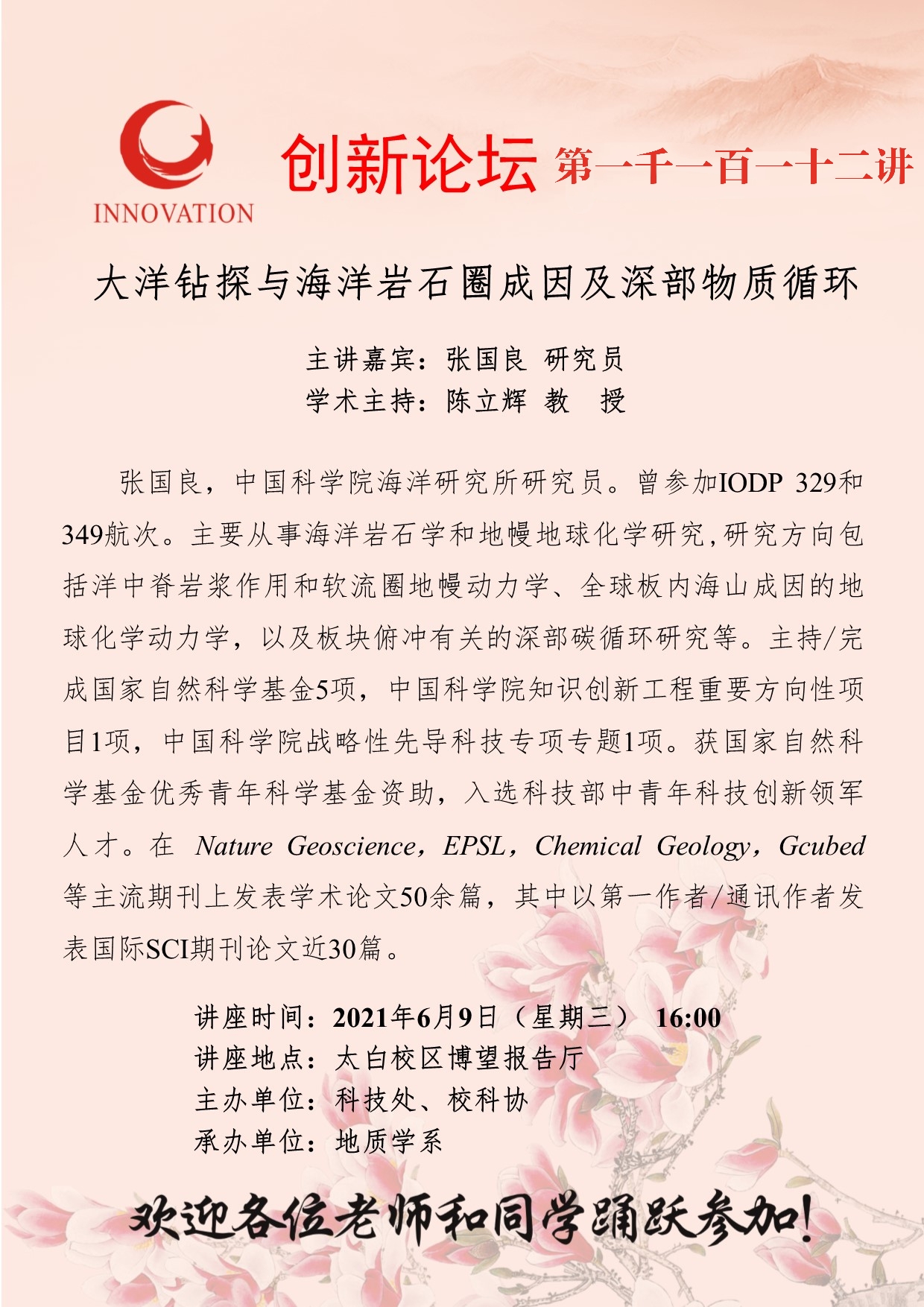 张国良 研究员 九游会在线登录官网创新论坛第一千一百一十二讲:大洋钻探与海洋岩石圈成因及深部物质循环 讲座时间 2021年6月9日(星期三) 16:00 讲座地点 太白校区博望报告厅 讲座人介绍 张国良 研究员 讲座内容