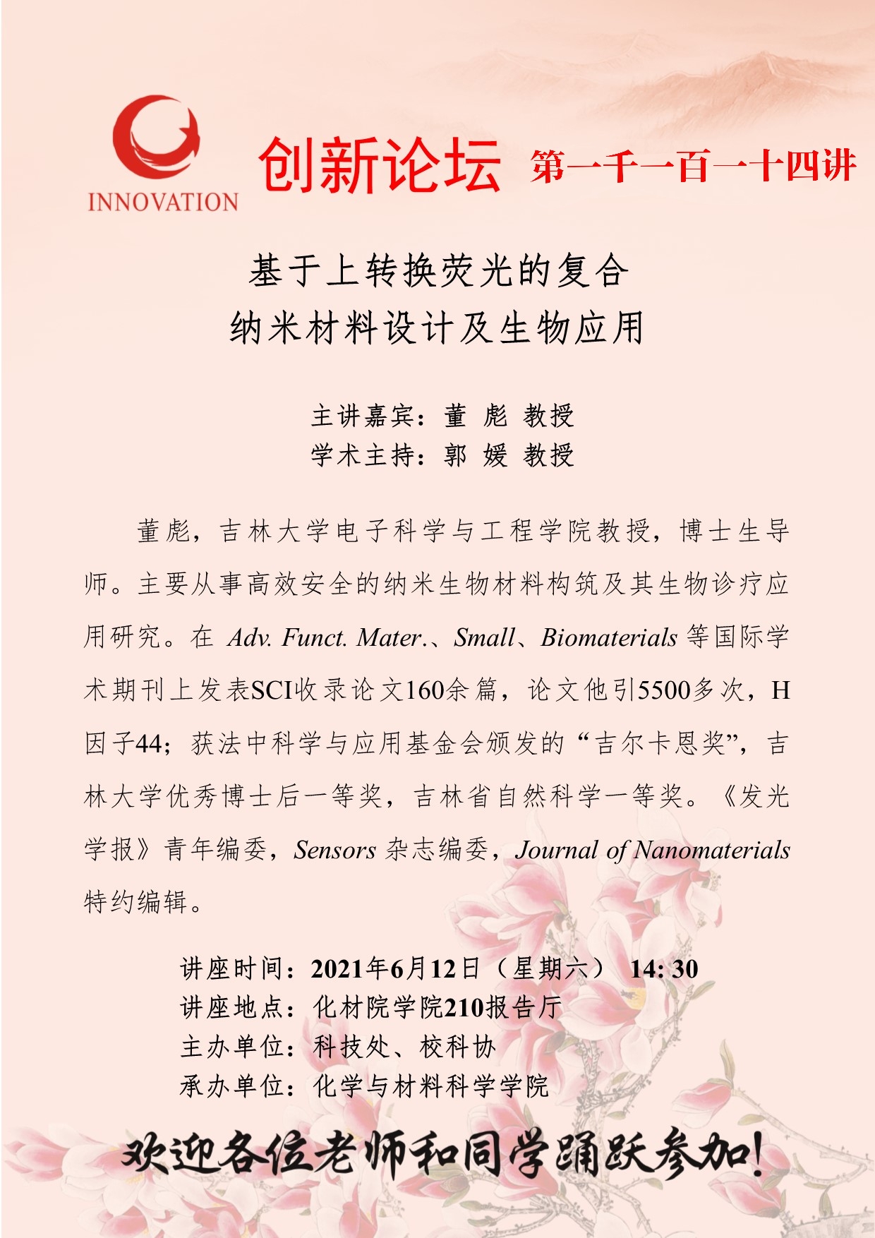 董彪 教授 九游会在线登录官网创新论坛第一千一百一十四讲:基于上转换荧光的复合纳米材料设计及生物应用 讲座时间 2021年6月12日(星期六) 14: 30 讲座地点 化材学院210报告厅 讲座人介绍 董彪 教授 讲座内容