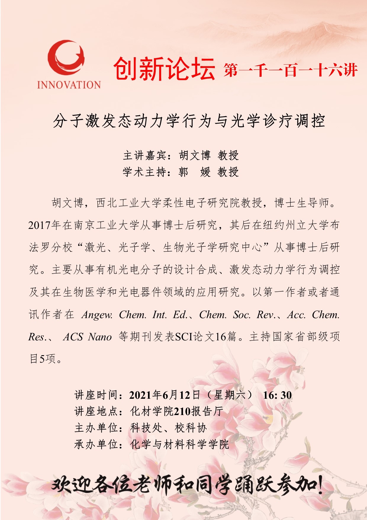 胡文博 教授 九游会在线登录官网创新论坛第一千一百一十六讲:分子激发态动力学行为与光学诊疗调控 讲座时间 2021年6月12日(星期六) 16:30 讲座地点 化材学院210报告厅 讲座人介绍 胡文博 教授 讲座内容