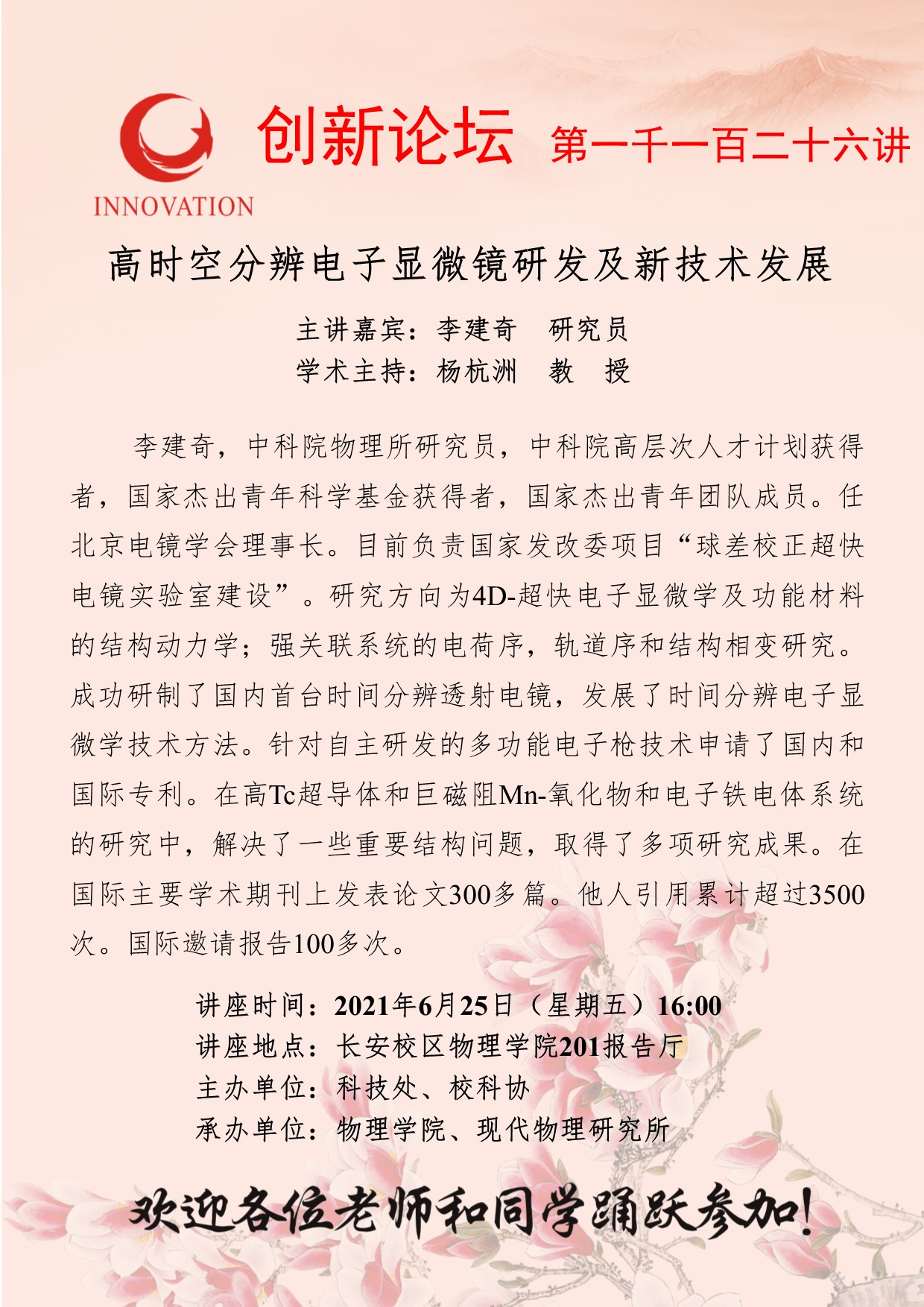 李建奇 研究员 九游会在线登录官网创新论坛第一千一百二十六讲:高时空分辨电子显微镜研发及新技术发展 讲座时间 2021年6月25日(星期五)16:00 讲座地点 长安校区物理学院201报告厅 讲座人介绍 李建奇 研究员 讲座内容