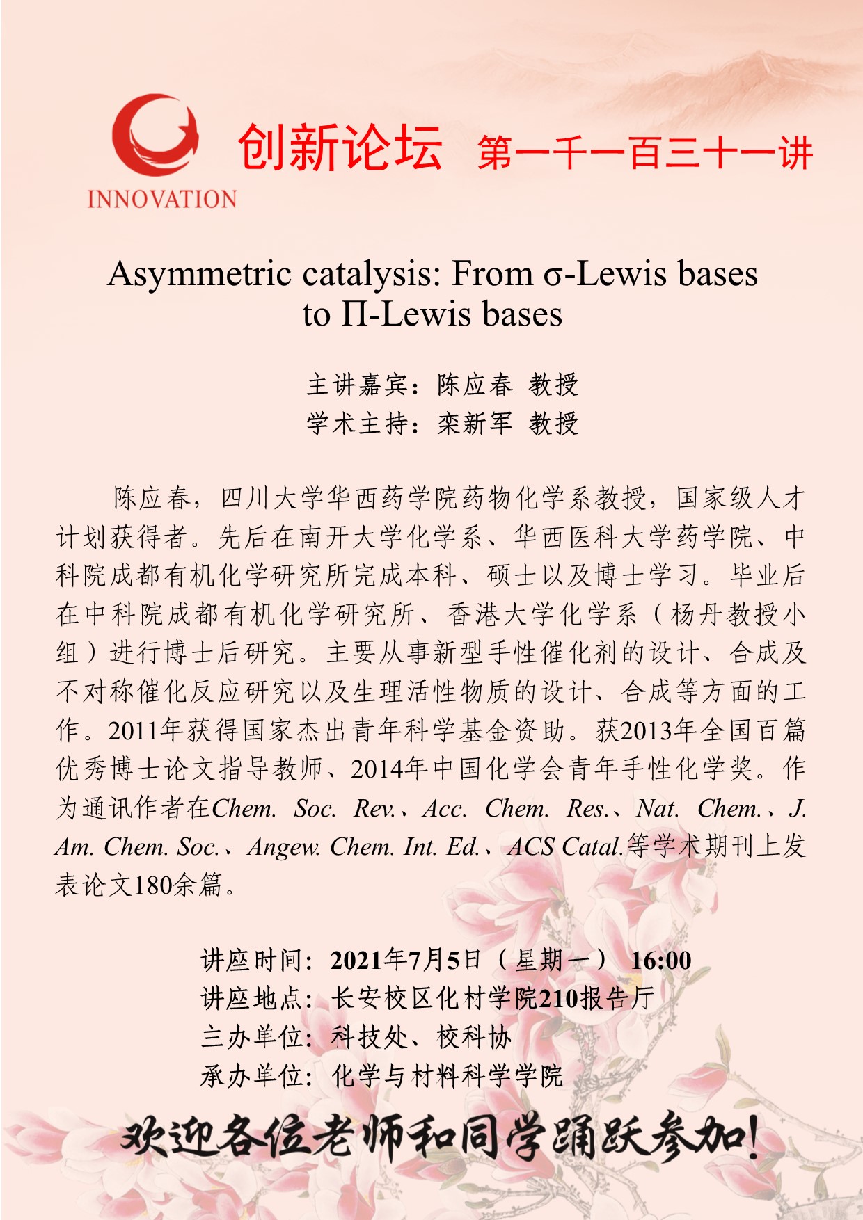 陈应春 教授 九游会在线登录官网创新论坛第一千一百三十一讲:Asymmetric catalysis: From σ-Lewis bases to Π-Lewis bases 讲座时间 2021年7月5日(星期一)16:00 讲座地点 长安校区化材学院210报告厅 讲座人介绍 陈应春 教授 讲座内容