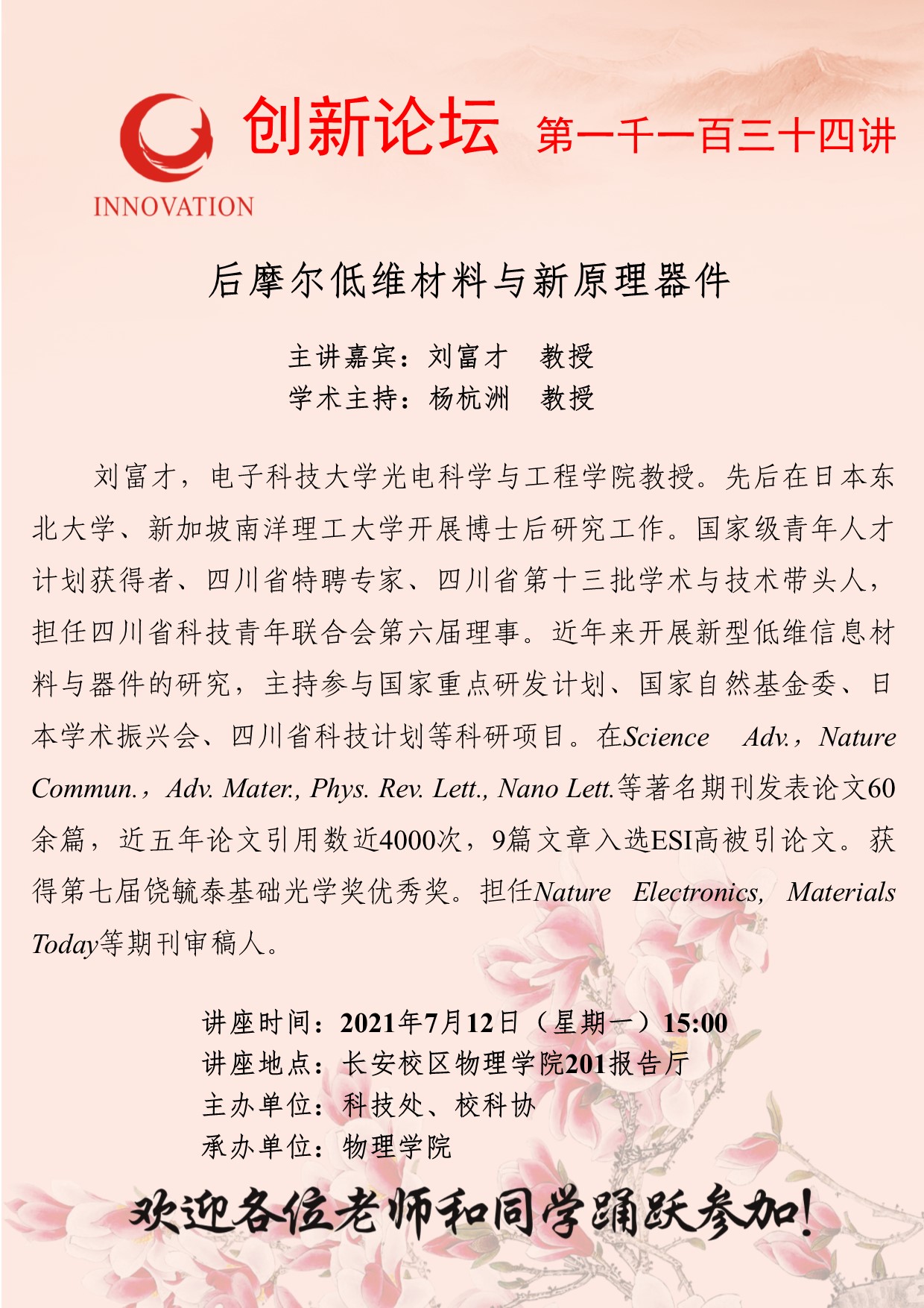 刘富才 教授 九游会在线登录官网创新论坛第一千一百三十四讲:后摩尔低维材料与新原理器件 讲座时间 2021年7月12日(星期一)15:00 讲座地点 长安校区物理学院201报告厅 讲座人介绍 刘富才 教授 讲座内容