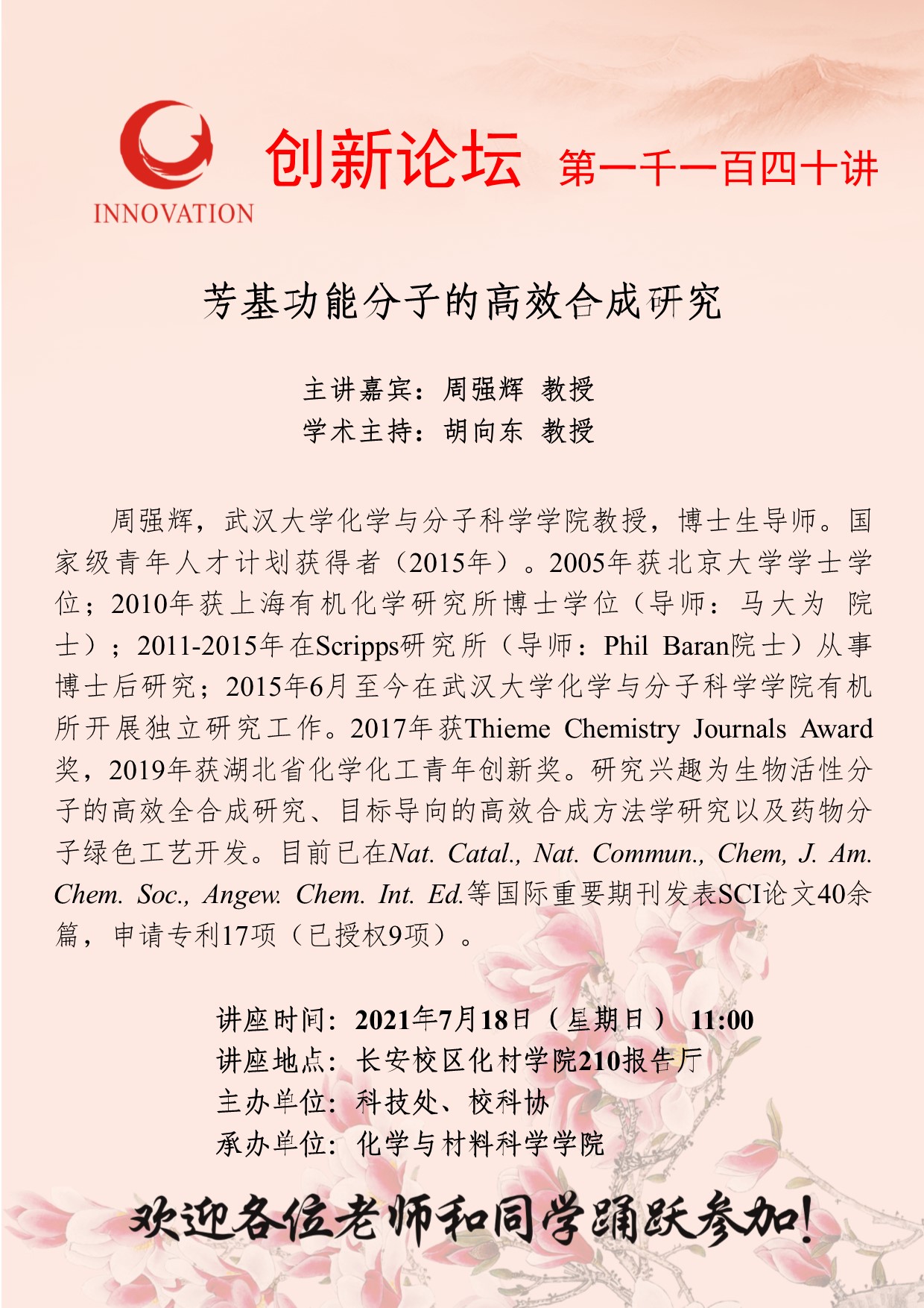 周强辉 教授 九游会在线登录官网创新论坛第一千一百四十讲:芳基功能分子的高效合成研究 讲座时间 2021年7月18日(星期日) 11:00 讲座地点 长安校区化材学院210报告厅 讲座人介绍 周强辉 教授 讲座内容