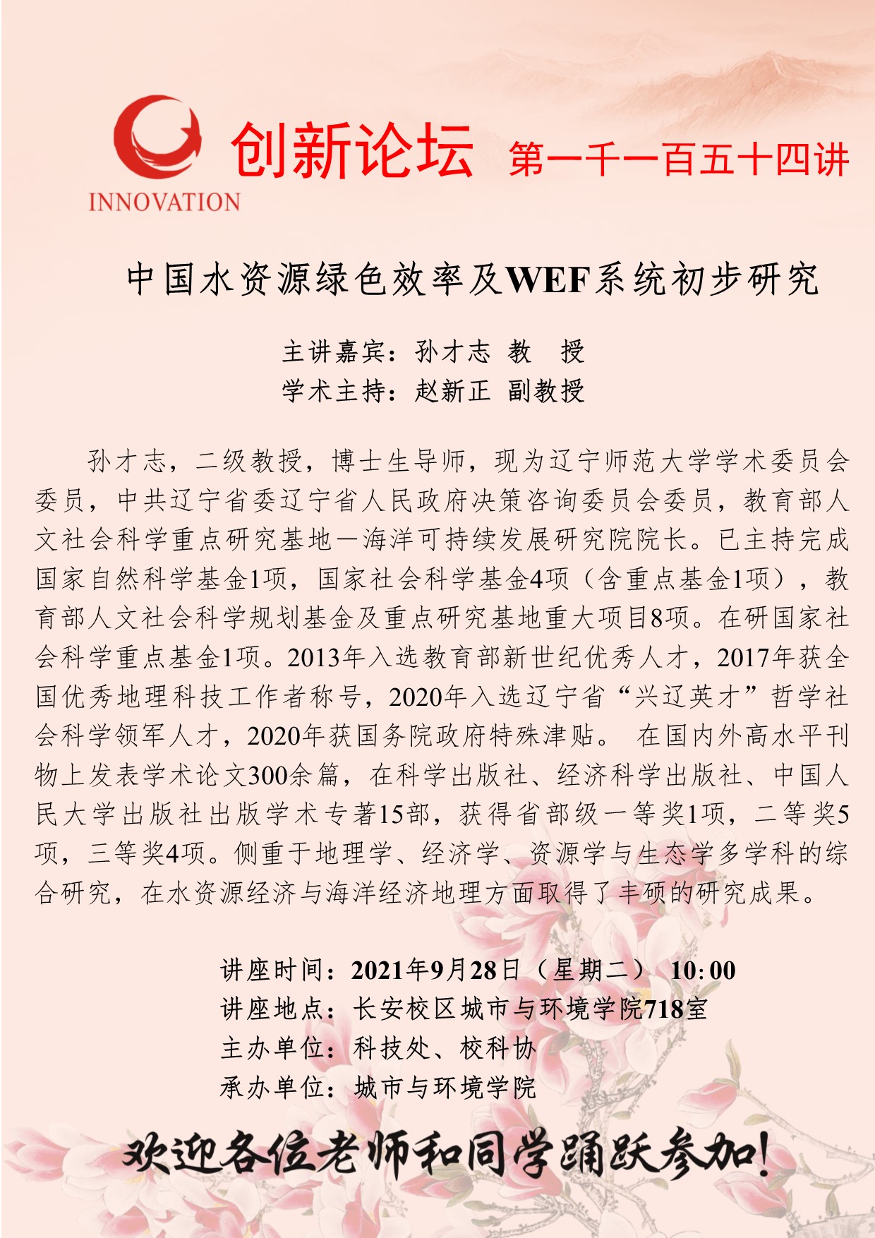 孙才志 教授 九游会在线登录官网创新论坛第一千一百五十四讲:中国水资源绿色效率及WEF系统初步研究 讲座时间 2021年9月28日(星期二) 10:00 讲座地点 长安校区城市与环境学院718室 讲座人介绍 孙才志 教授 讲座内容