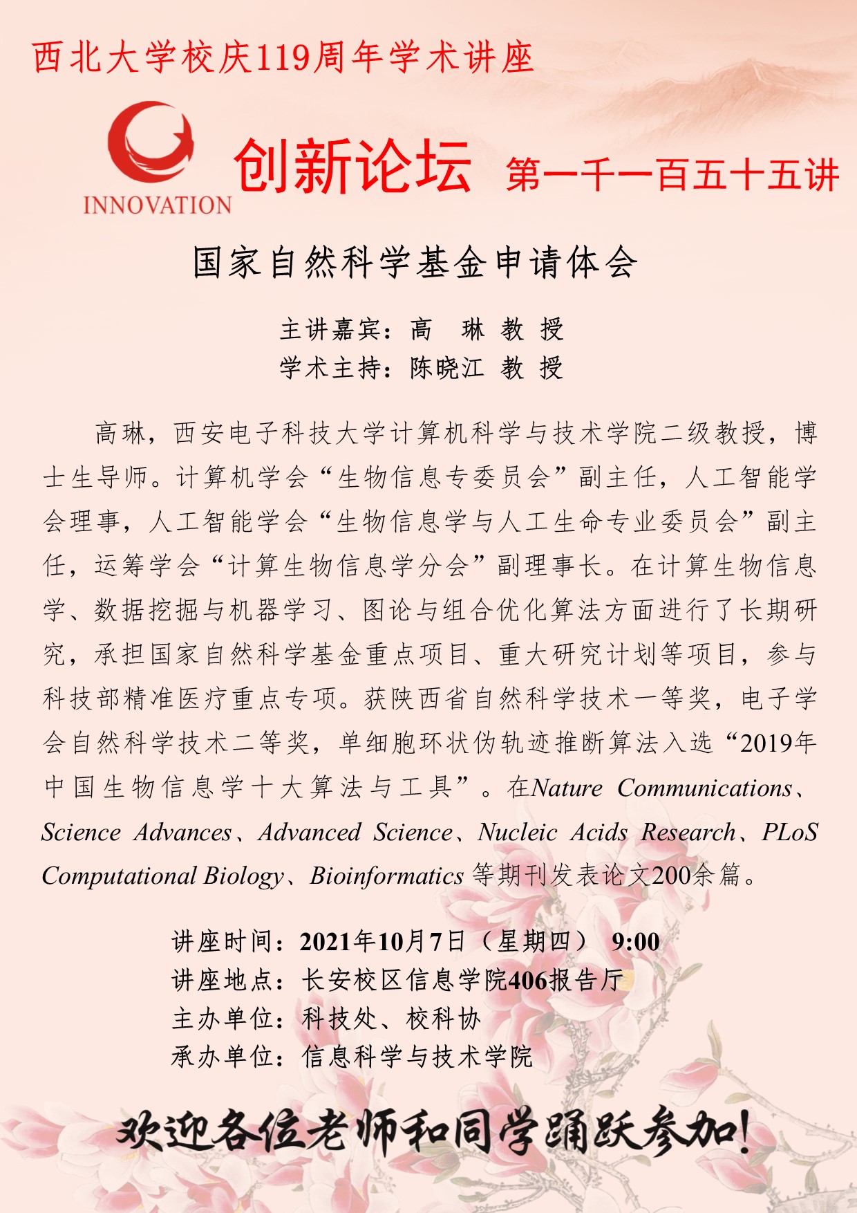 高琳 教授 九游会在线登录官网创新论坛第一千一百五十五讲暨校庆119周年学术讲座: 国家自然科学基金申请体会 讲座时间 2021年10月7日(星期四) 9:00 讲座地点 长安校区信息学院406报告厅 讲座人介绍 高琳 教授 讲座内容