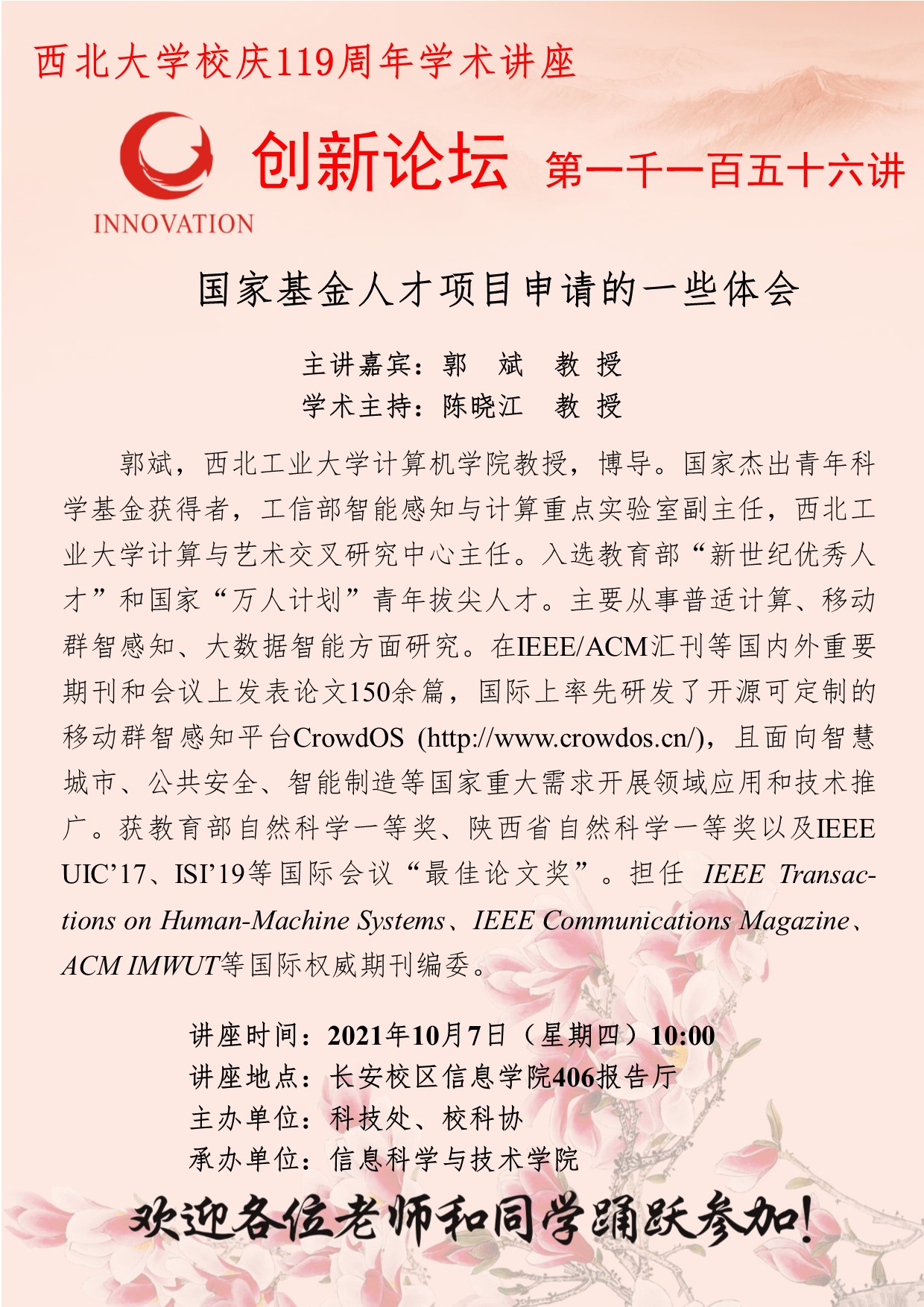 郭斌 教授 九游会在线登录官网创新论坛第一千一百五十六讲暨校庆119周年学术讲座: 国家基金人才项目申请的一些体会 讲座时间 2021年10月7日(星期四)10:00 讲座地点 长安校区信息学院406报告厅 讲座人介绍 郭斌 教授 讲座内容