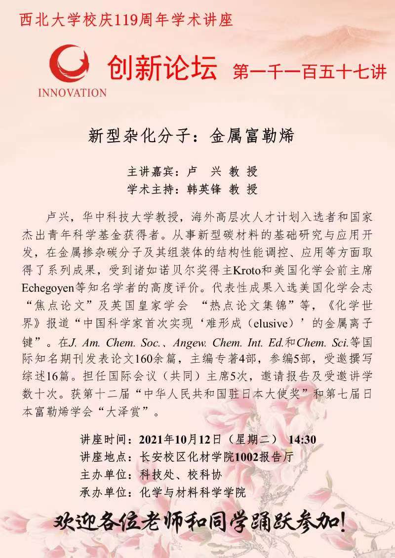 卢兴 教授 九游会在线登录官网创新论坛第一千一百五十七讲暨校庆119周年学术讲座: 新型杂化分子:金属富勒烯 讲座时间 2021年10月12日(星期二)14:30 讲座地点 长安校区化材学院1002报告厅 讲座人介绍 卢兴 教授 讲座内容