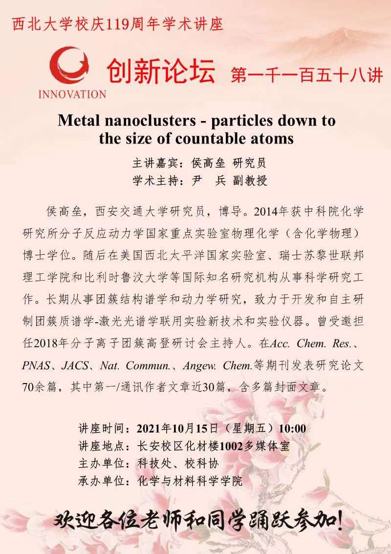 侯高垒 研究员 九游会在线登录官网创新论坛第一千一百五十八讲暨校庆119周年学术讲座: Metal nanoclusters - particles down to the size of countable atoms 讲座时间 2021年10月15日(星期五)10:00 讲座地点 长安校区化材楼1002多媒体室 讲座人介绍 侯高垒 研究员 讲座内容