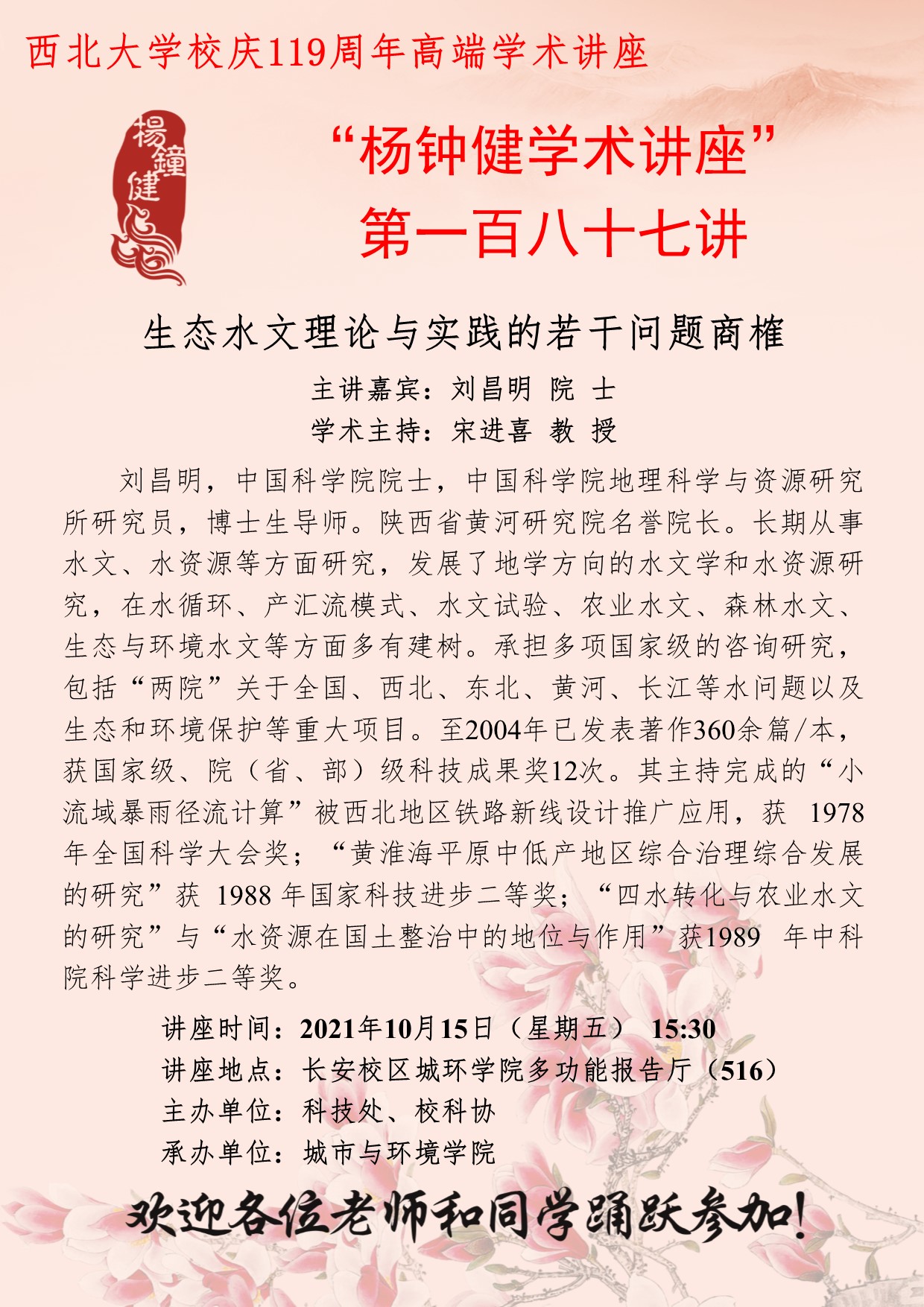 “杨钟健学术讲座”第一百八十七讲暨校庆119周年高端学术讲座:生态水文理论与实践的若干问题商榷