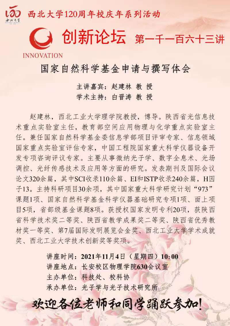 赵建林 教授 九游会在线登录官网创新论坛第一千一百六十三讲暨120周年校庆年系列活动:国家自然科学基金申请与撰写体会 讲座时间 2021年11月4日(星期四)10:00 讲座地点 长安校区物理学院630会议室 讲座人介绍 赵建林 教授 讲座内容