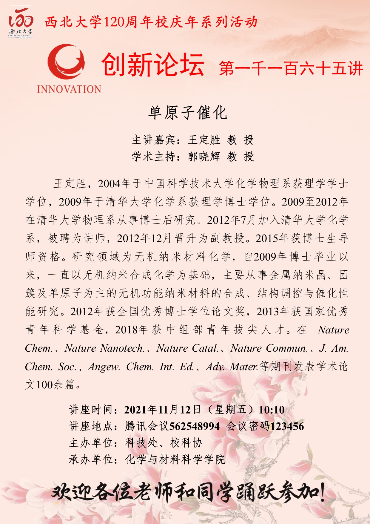 王定胜 教授 九游会在线登录官网创新论坛第一千一百六十五讲暨120周年校庆年系列活动:单原子催化 讲座时间 2021年11月12日(星期五)10:10 讲座地点 腾讯会议562548994 会议密码123456 讲座人介绍 王定胜 教授 讲座内容