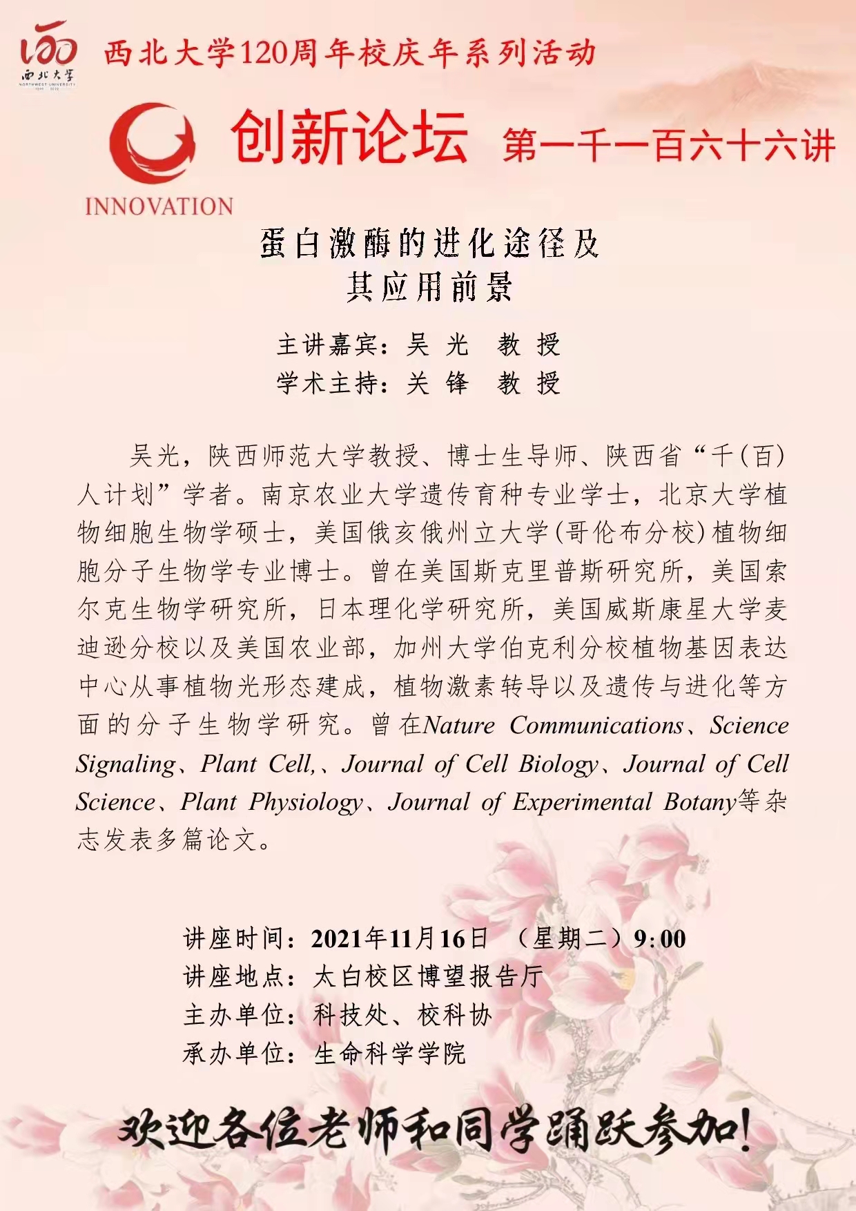 吴光 教授 九游会在线登录官网创新论坛第一千一百六十六讲暨120周年校庆年系列活动:蛋白激酶的进化途径及其应用前景 讲座时间 2021年11月16日 (星期二)9:00 讲座地点 太白校区博望报告厅 讲座人介绍 吴光 教授 讲座内容