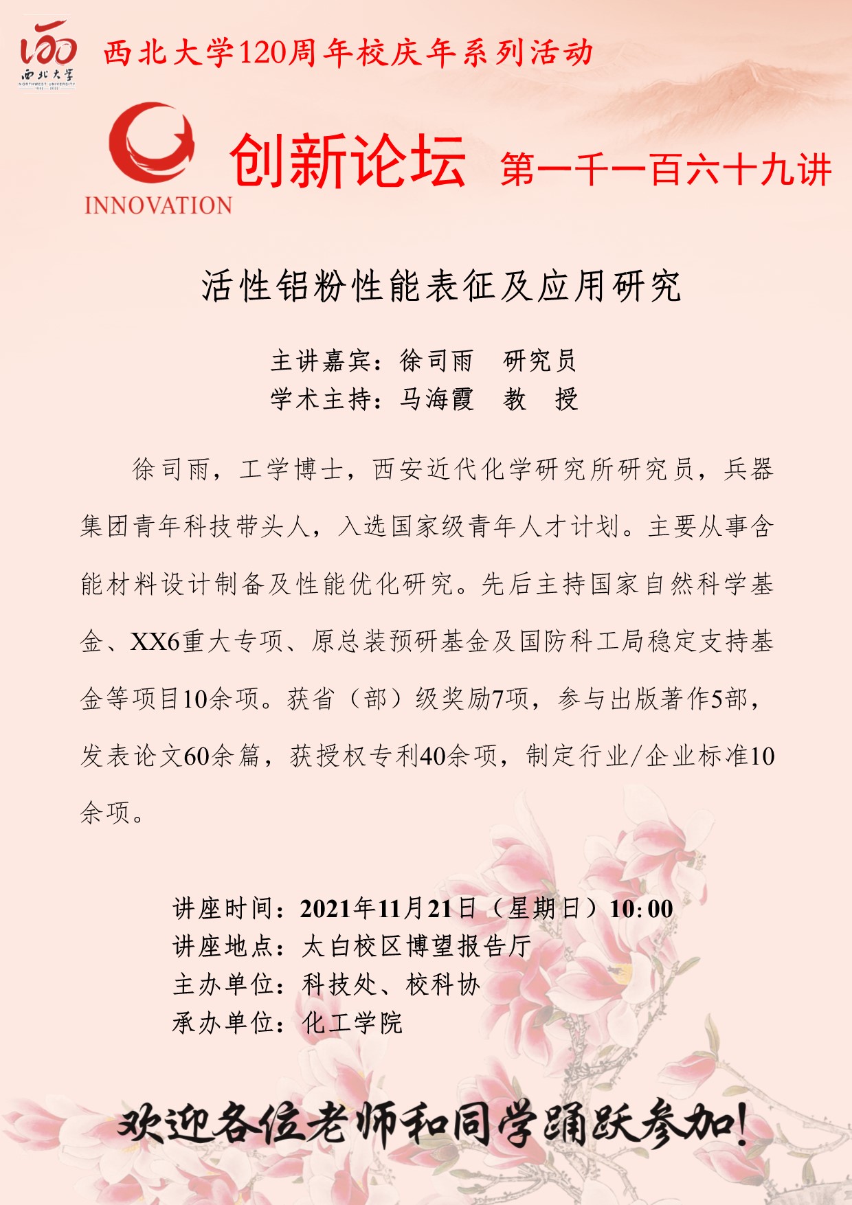 徐司雨 研究员 九游会在线登录官网创新论坛第一千一百六十九讲暨120周年校庆年系列活动:活性铝粉性能表征及应用研究 讲座时间 2021年11月21日(星期日)10:00 讲座地点 太白校区博望报告厅 讲座人介绍 徐司雨 研究员 讲座内容