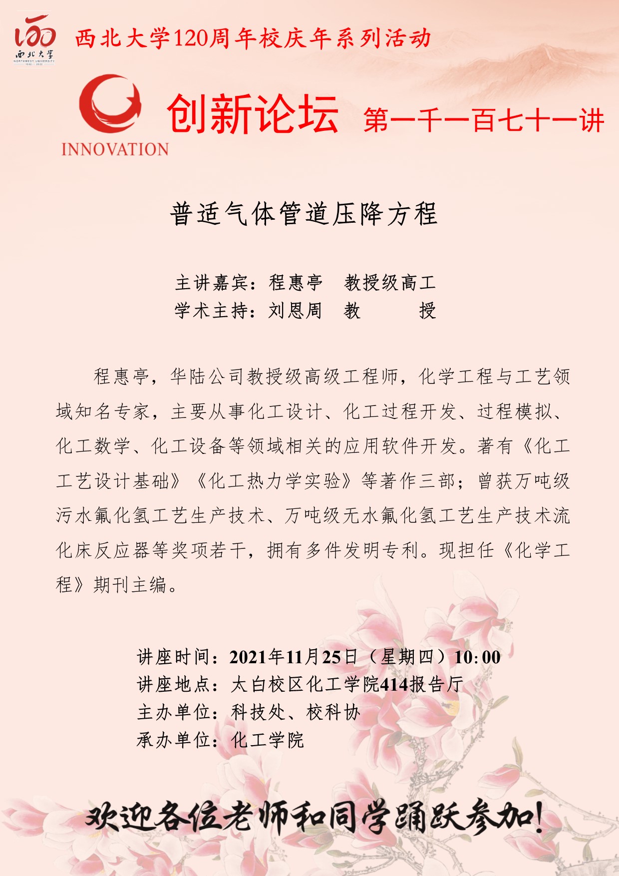程惠亭 教授级高工 九游会在线登录官网创新论坛第一千一百七十一讲暨120周年校庆年系列活动:普适气体管道压降方程 讲座时间 2021年11月25日(星期四)10:00 讲座地点 太白校区化工学院414报告厅 讲座人介绍 程惠亭 教授级高工 讲座内容