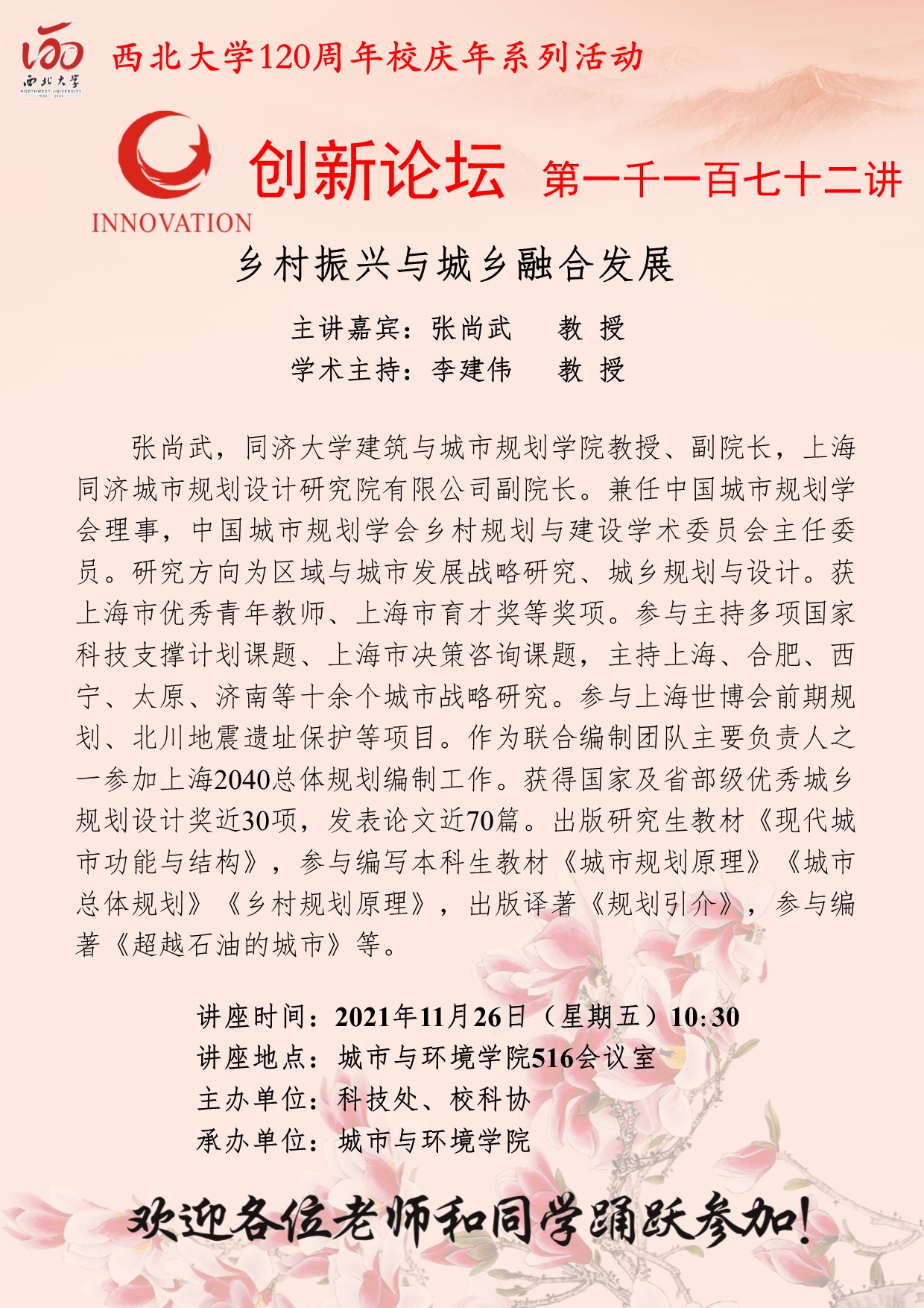 张尚武 教授 九游会在线登录官网创新论坛第一千一百七十二讲暨120周年校庆年系列活动:乡村振兴与城乡融合发展 讲座时间 2021年11月26日(星期五)10:30 讲座地点 城市与环境学院516会议室 讲座人介绍 张尚武 教授 讲座内容