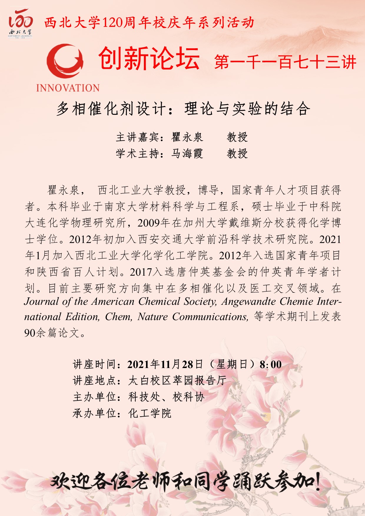 瞿永泉 教授 九游会在线登录官网创新论坛第一千一百七十三讲暨120周年校庆年系列活动:多相催化剂设计:理论与实验的结合 讲座时间 2021年11月28日(星期日)8:00 讲座地点 太白校区萃园报告厅 讲座人介绍 瞿永泉 教授 讲座内容