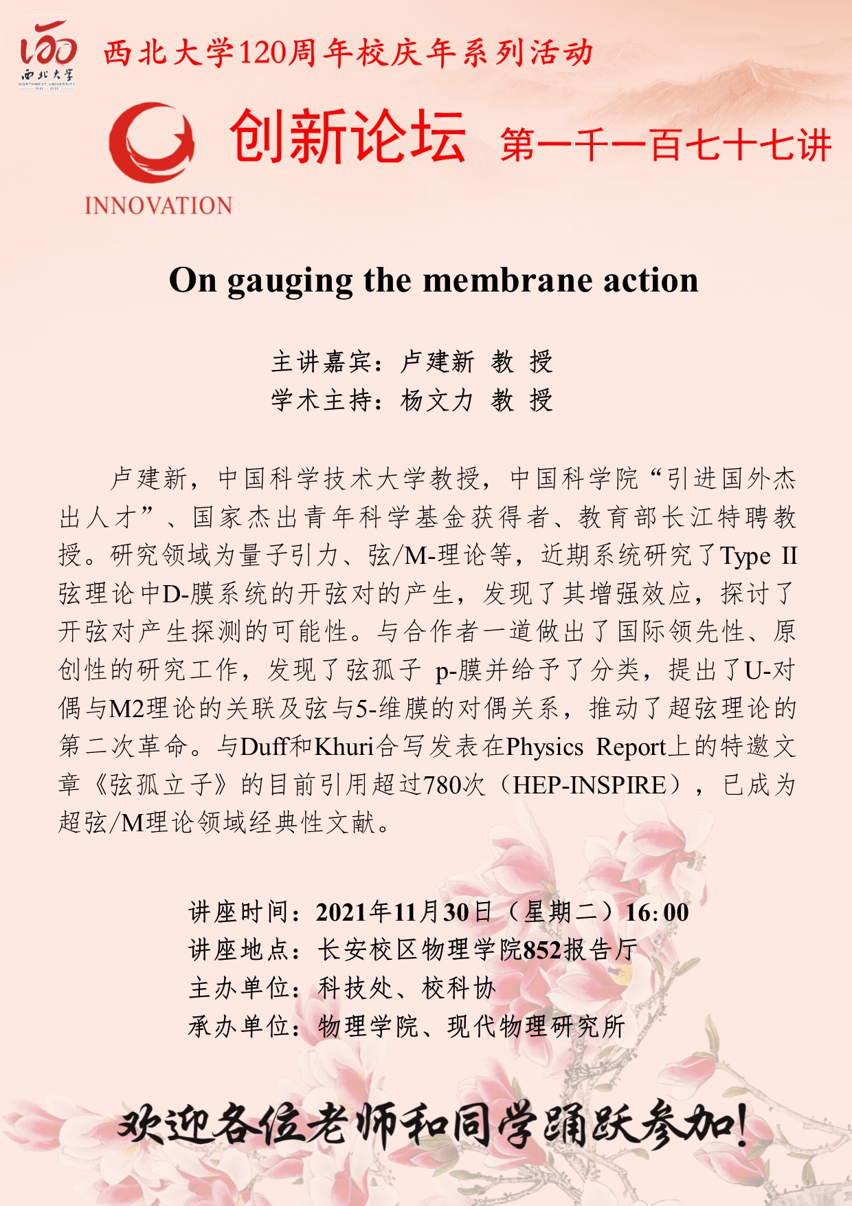 卢建新 教授 九游会在线登录官网创新论坛第一千一百七十七讲暨120周年校庆年系列活动:On gauging the membrane action 讲座时间 2021年11月30日(星期二)16:00 讲座地点 长安校区物理学院852报告厅 讲座人介绍 卢建新 教授 讲座内容