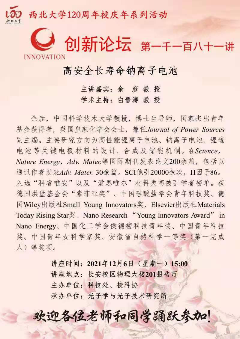 余彦 教授 九游会在线登录官网创新论坛第一千一百八十一讲暨120周年校庆年系列活动:高安全长寿命钠离子电池 讲座时间 2021年12月6日(星期一)15:00 讲座地点 长安校区物理大楼201报告厅 讲座人介绍 余彦 教授 讲座内容