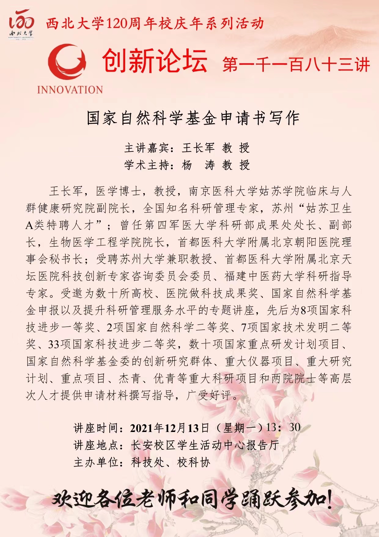 王长军 教授 九游会在线登录官网创新论坛第一千一百八十三讲暨120周年校庆年系列活动:国家自然科学基金申请书写作 讲座时间 2021年12月13日(星期一)13:30 讲座地点 长安校区学生活动中心报告厅 讲座人介绍 王长军 教授 讲座内容
